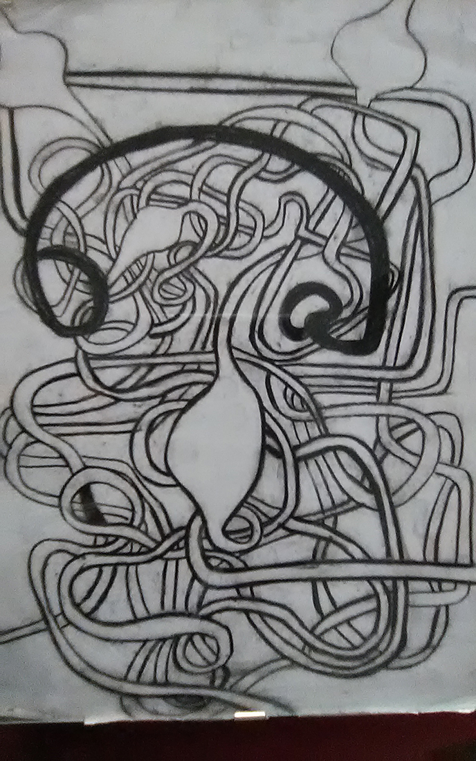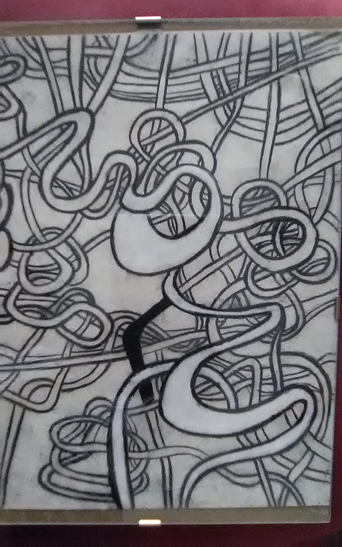 Opera in carboncino su carta, parte di un progetto più ampio che ne comprende oltre le 100, per comporre un’illusione ottica finale, dovuta al intersecarsi di questi filamenti, o percorsi ricercati, intitolata ”Vita Interiore” come doppio senso fra l’umana anatomia interna, e un messaggio più sottile che si lega alla vita interiore dello spirito, a ciò che vi è dentro di invisibile, dal opera emerge che quello che può essere interno talvolta sono ”ignoti”, per sfiorare l’idea, attraverso la figura del mostro, inteso in accezione positiva come parte ignota o inconscia dell’essere umano, del mistero che è sopra tutte le cose.