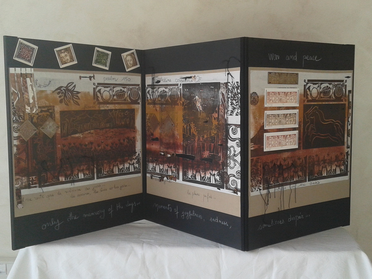 mixte gravures avec matrices originales cousues, noeuds et d, tryptique recto/verso avec papier wenzhou sur carton mousse noir