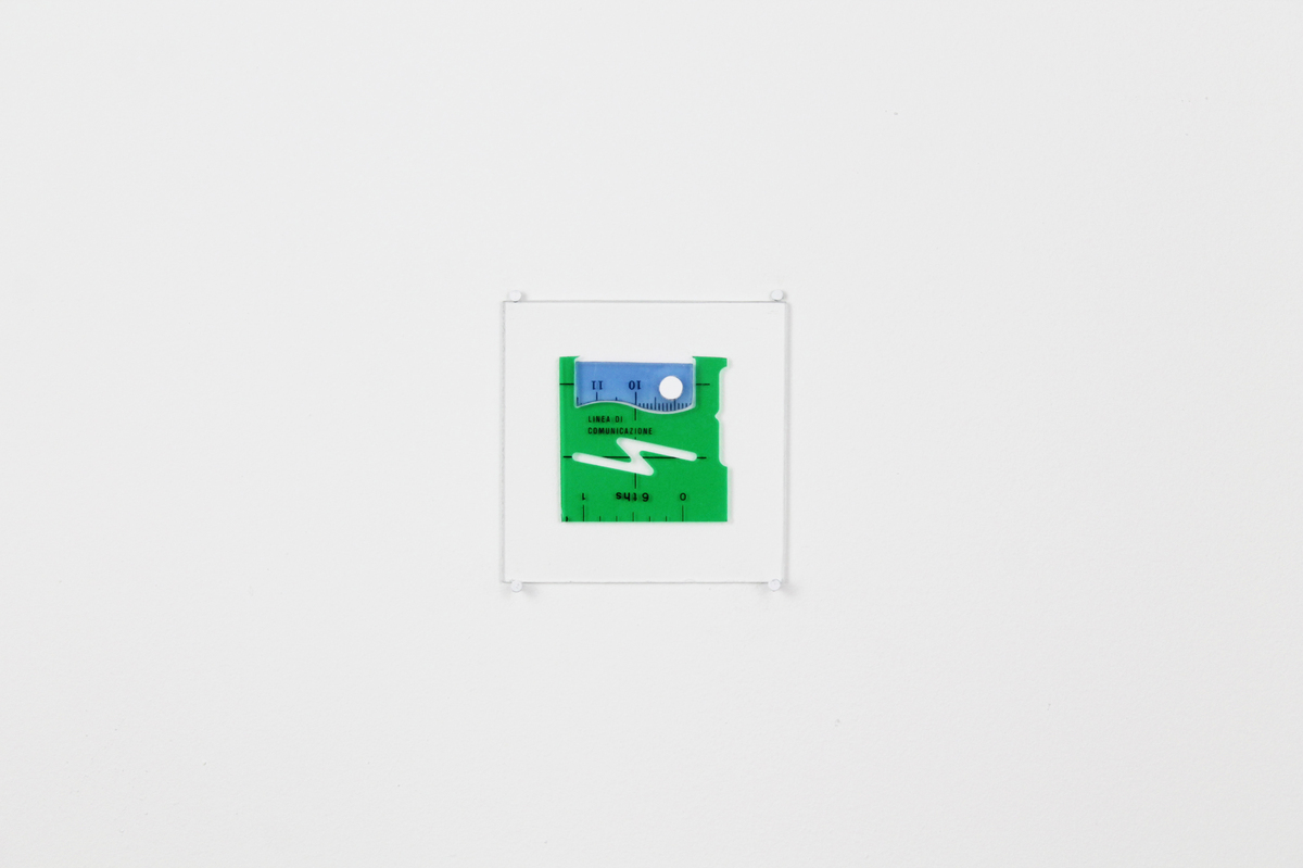 gognometro, righelli e normografo sagomati su plexiglass e erba sintetica, plexiglass