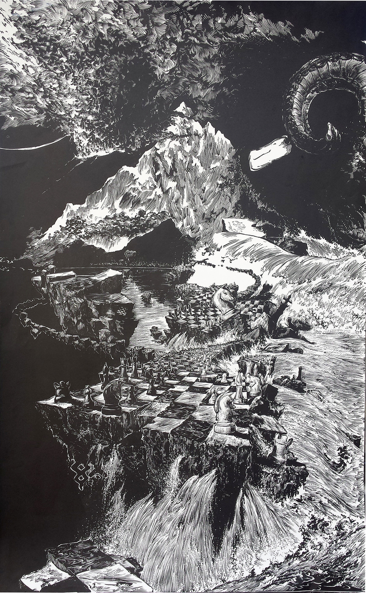 24xVII part two: Chess with Life engraving, linoleum 60x100cm