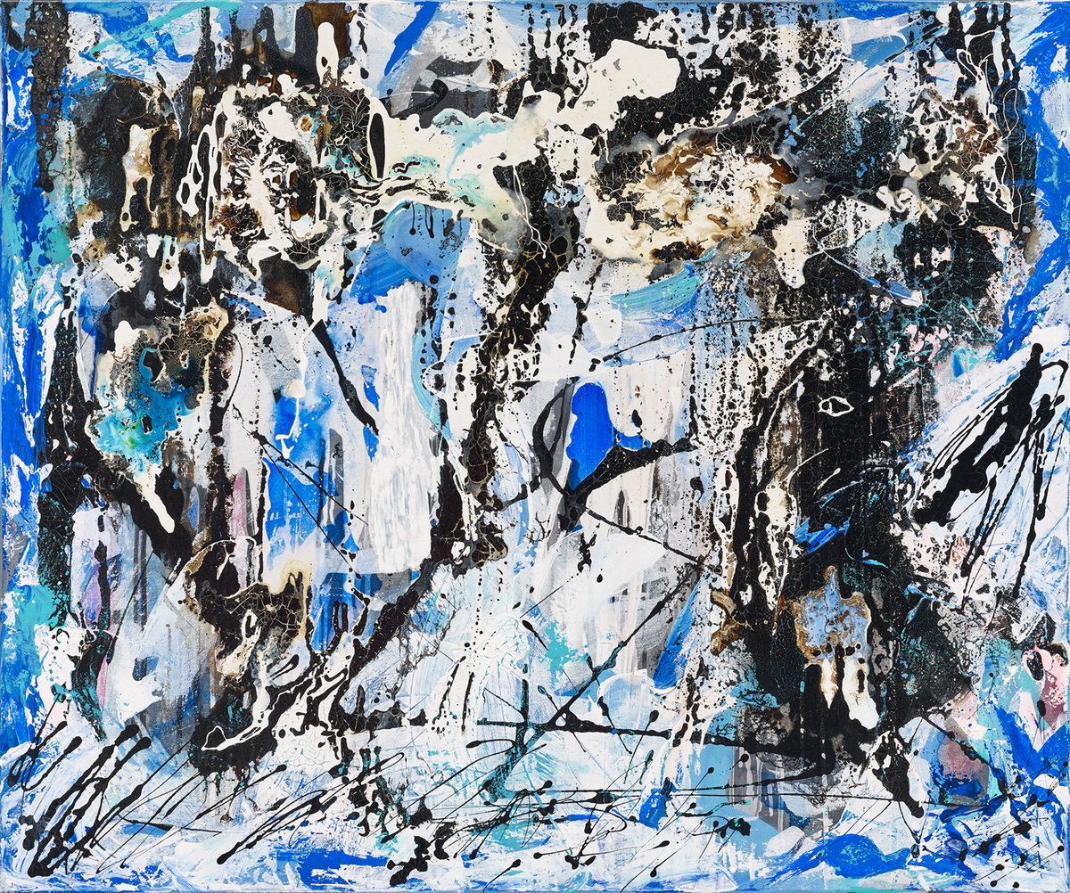The first layer of the painting was acrylic, then I worked as well with mixed media technics of gloss paints, liquid bitumen, ink, pigments, stain, spirit and turpentine.