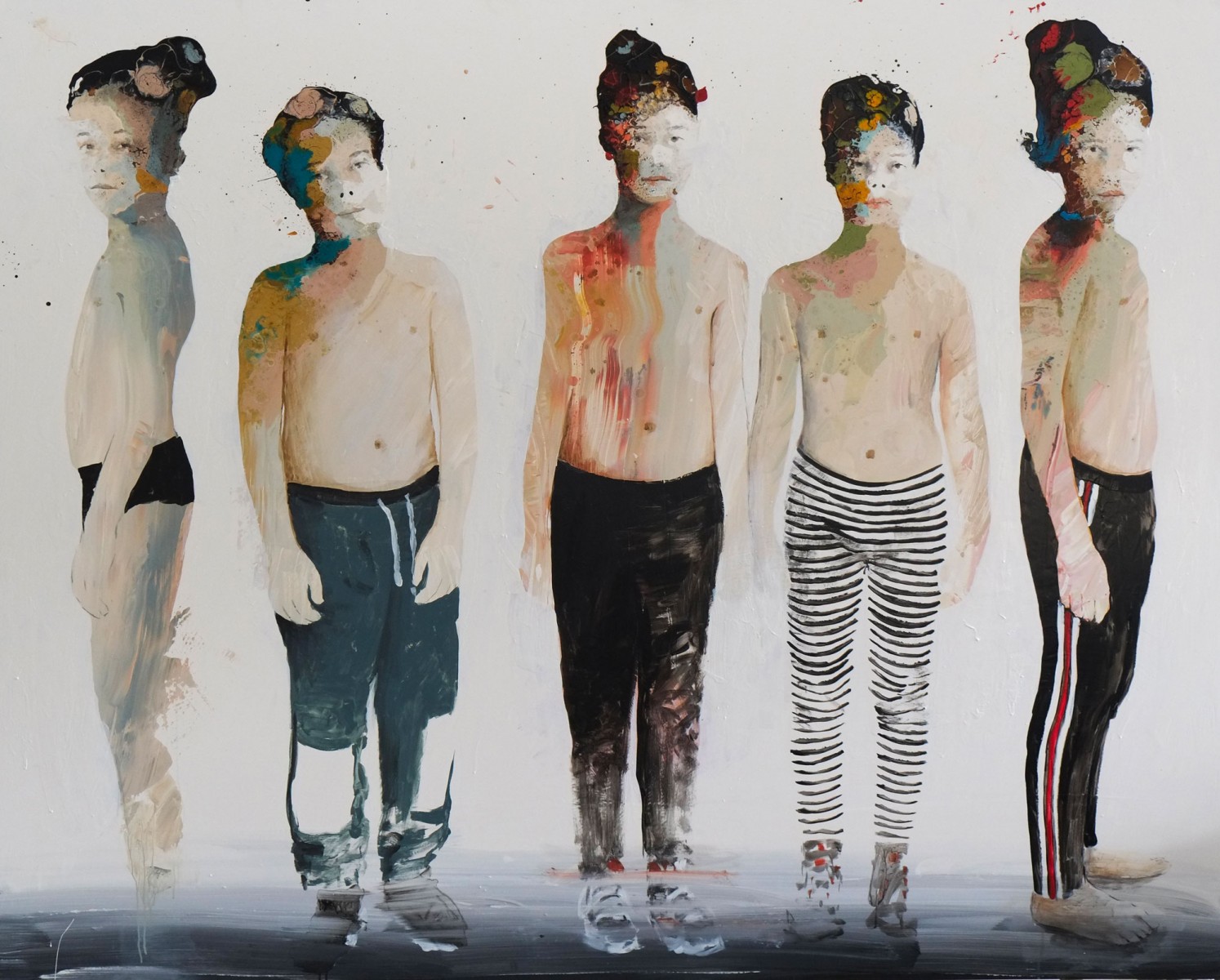 E’ un’opera che ho dipinto pensando al delicato universo emotivo che ha accompagnato ogni bambino durante il periodo della didattica a distanza. Ci sono cinque bambini tra i sette e i dieci anni di età, tutti in piedi e a torso nudo. Alcuni guardano l’osservatore con aria di sfida, altri in cerca di conforto, tutti un po’ smarriti, a fare i conti con la frustrazione che li immobilizza e li rende inermi. Nei loro visi e nella loro pelle crepe di colore che si espandono e si aprono per fare spazio forse ad un futuro migliore.