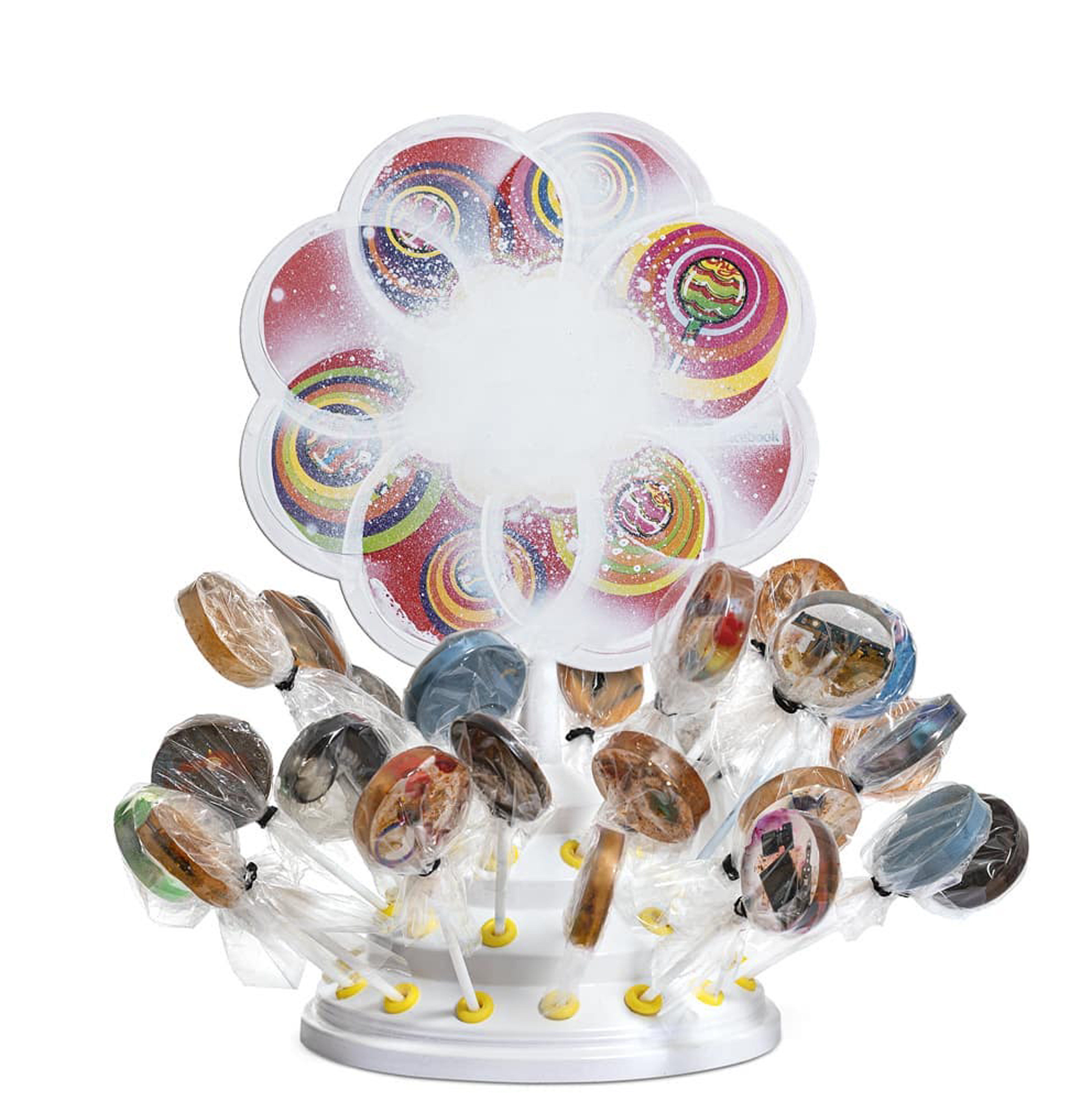 la scultura è composta da un espositore di plastica riciclata e n 37 Lecca lecca realizzati con resina epossidica e rifiuti organici e inorganici.