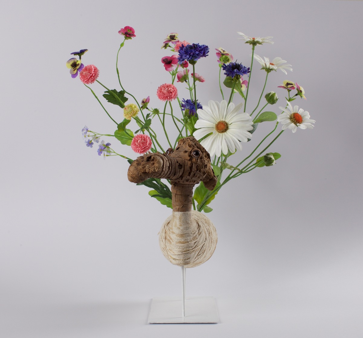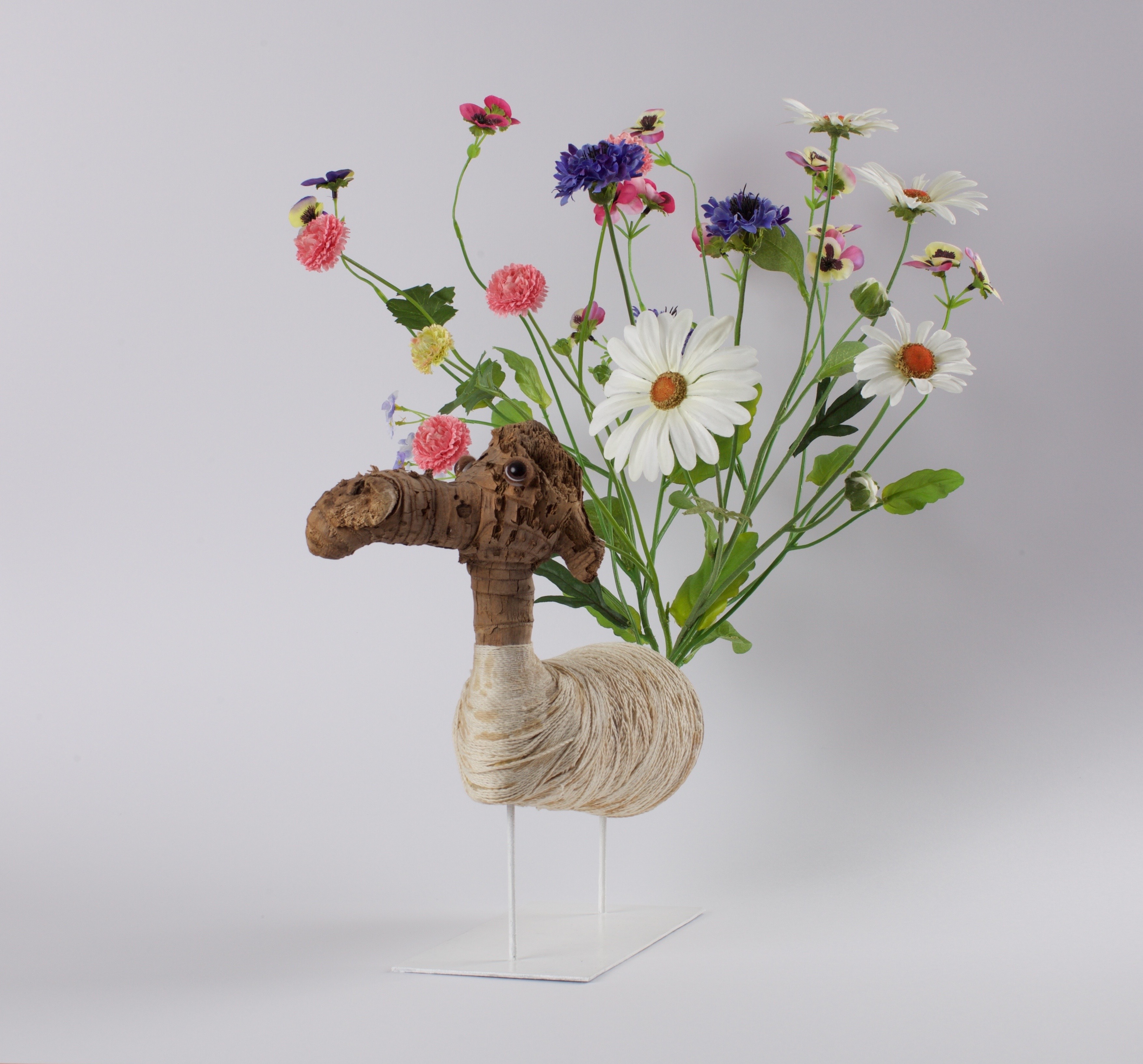 L’opera è il risultato di un assemblaggio tra un ceppo di palma, un rocchetto di cotone e la riproduzione in plastica di un bouquet di fiori di campo, il tutto montato su una struttura in ferro. Questi elementi – legno, cotone, plastica e ferro – costituiscono parte della materia prima con cui mi confronto da anni. Il cavallo che fiorisce è una creatura ibrida, generata per affermare nella realtà la costante centralità che ha per me l’immaginazione come forma di esistenza e di identità.