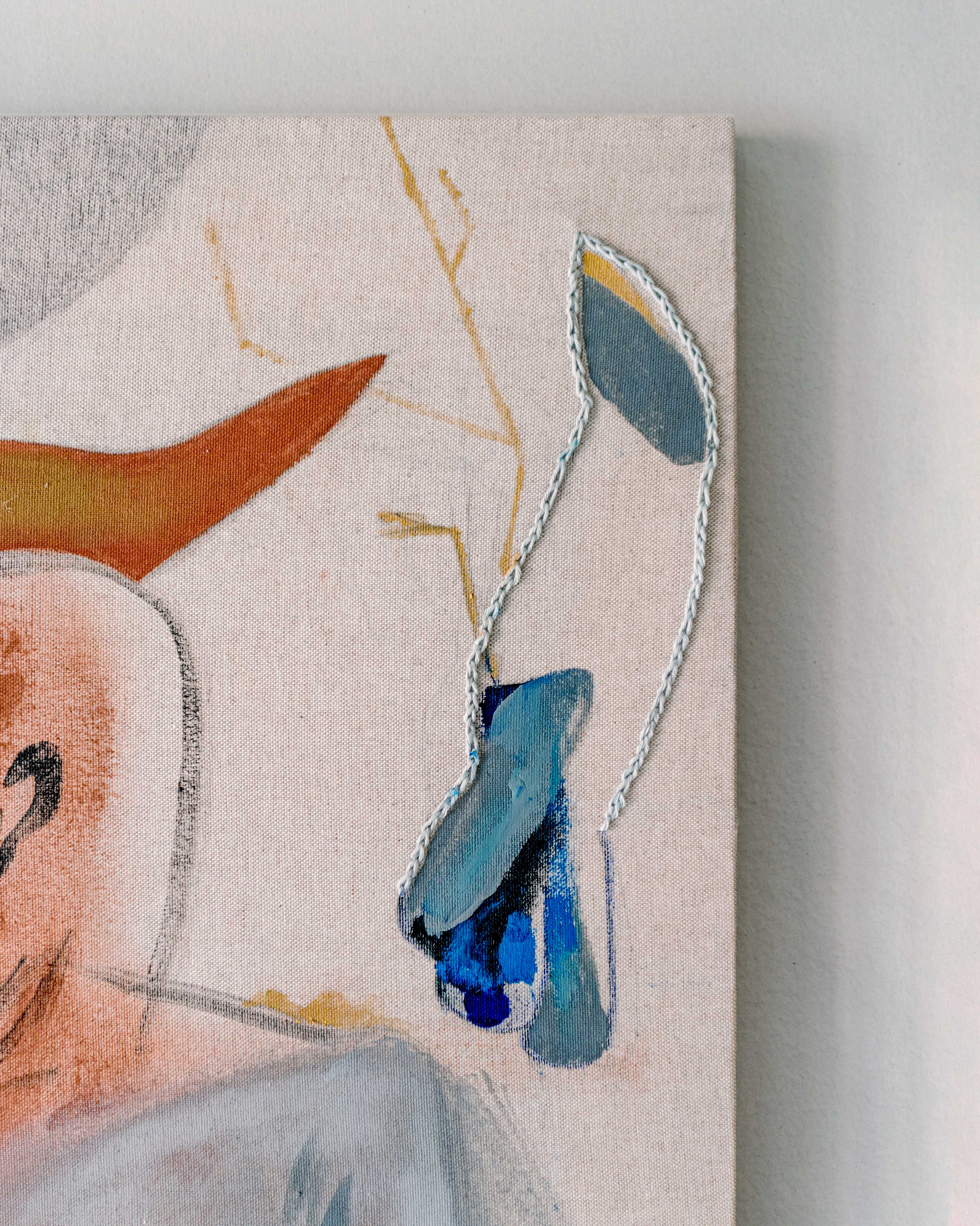 Riconosco la coperta a quadretti, le linee azzurre degli strofinacci con cui pulisco i pennelli, che disegnano le verticali e le orizzontali che un tempo avevano la forma di una croce, e il telaio stesso, l’oggetto grazie al quale ho imparato ad annodare tra loro fili e respiro di questo tempo. Ci sono animali e animali umani, veicolo di un’energia “selvatica” che mi indica la via d’uscita, la tensione salvifica. Il femminile e il maschile, che appaiono ibridi in ogni cosa e non permettono un’identificazione chiara. La morte che trasforma uno stadio dell’essere. E la sessualità, o meglio la procreazione, in cui il bambino e la morte sono un unicum, come gli opposti di un processo che si completa e si ripete. Poi il ricamo. La sua presenza nel dipinto non ha uno scopo decorativo ma funzionale, aumenta l’intensità delle campiture di colore rendendole vibranti e tridimensionali. Il filo è visibile nel supporto della tela grezza così come nel ricamo e diventa una prominenza della superficie pittorica, una spinta fisica in avanti.