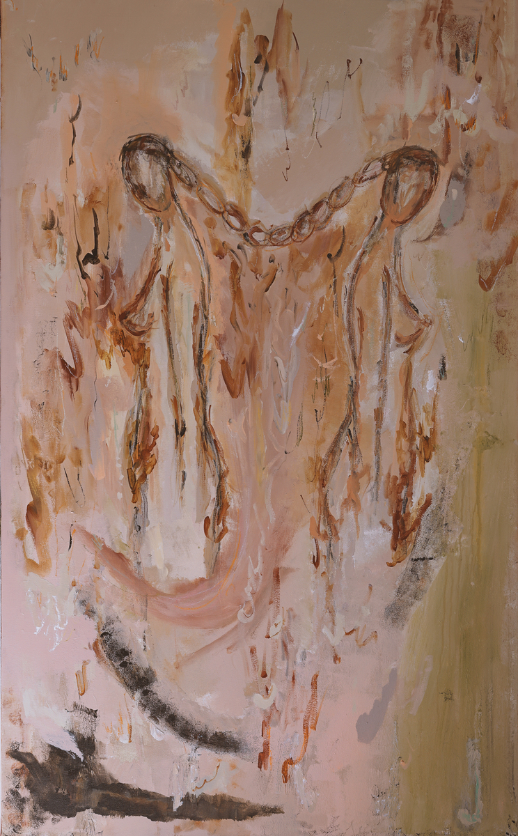 The composition of my painting is a symbolic representation of the auras of our unlived lives; a curse or blessing of our capitalist generation haunted by infinite possibilities and the wander over what might have been. The protagonists of the narrative stand back to back to each other, connected through a braid; representing the allegedly negative space of the real life and the imagined life which we never lived.