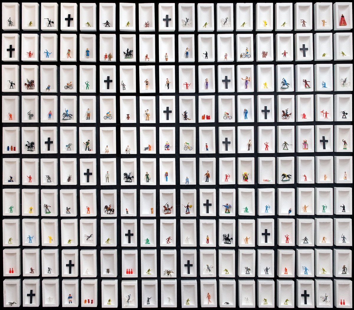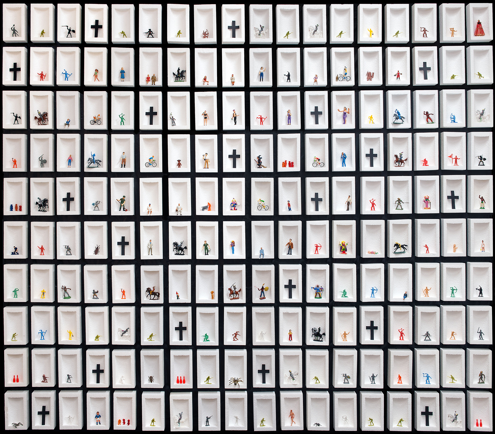 I am a multidisciplinary artist, working in the fields of photography, installation, painting, drawing, objects and land art. The submitted image shows a photography of an art-installation I have made together with my wife in 2020 on the occasion of the Corona Crisis. The image ”Corona-Isolation-1” shows the whole installation, which is exhibited in my studio (size: 300 x 260 cm).