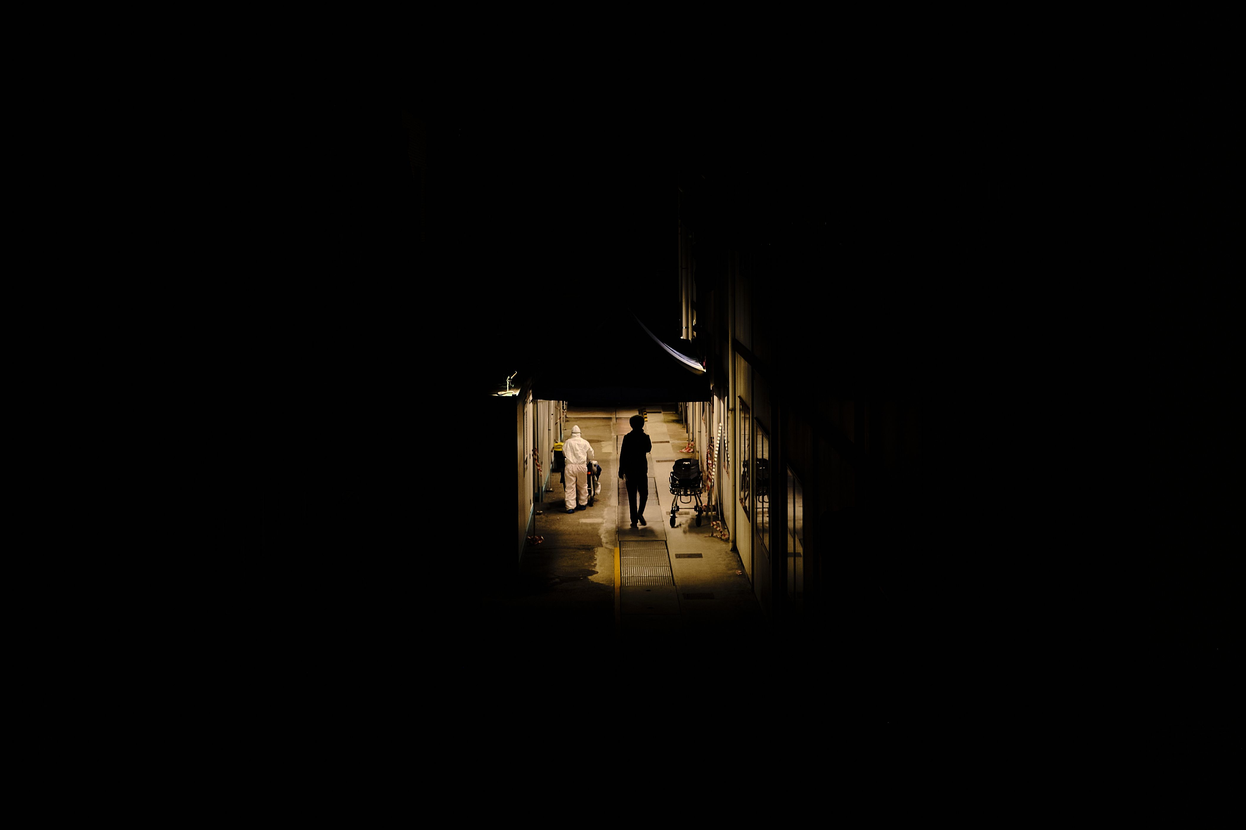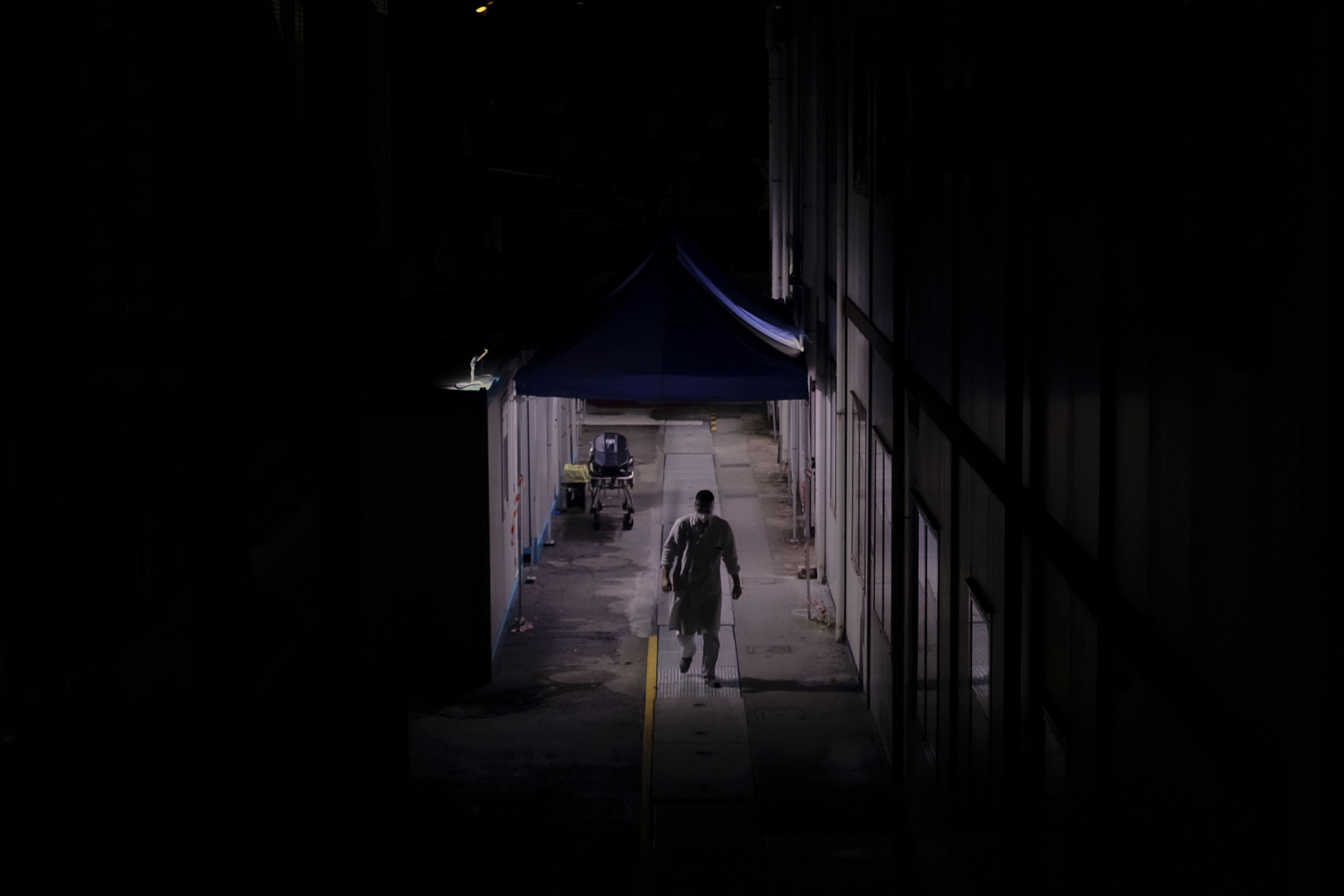 Durante il turno di notte, un’infermiera si sposta all’interno dell’area COVID del Pronto Soccorso del policlinico di Padova, uno dei più grandi ospedali italiani. Tutto attorno a questo luogo che non dorme mai, vi è una città che invece sta dormendo; è una ”bolla di luce” nell’oscurità della notte, sempre al lavoro ed in movimento. Questa immagine, tratta da una serie di fotografie scattate durante il lavoro notturno in questo ospedale, vuole anche essere un ritratto psicologico, un ritratto di quello che la pandemia da coronavirus ha portato agli operatori sanitari nei momenti di maggiore difficoltà: la sensazione di essere soli, alienati, sopraffatti.