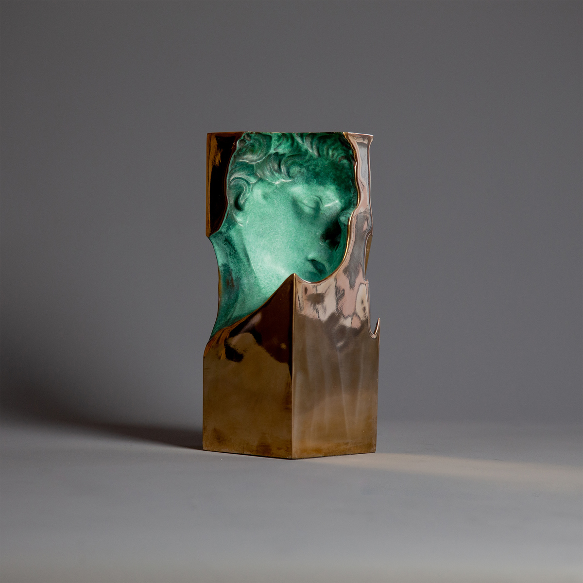 L’esterno dorato lucido la rende irresistibile e nasconde il lascito di un fossile mitologico. Il soggetto classico appare o scompare nella sua forma negativa, come se da lì fosse fuggito nell’attimo precedente allo sguardo del osservatore.