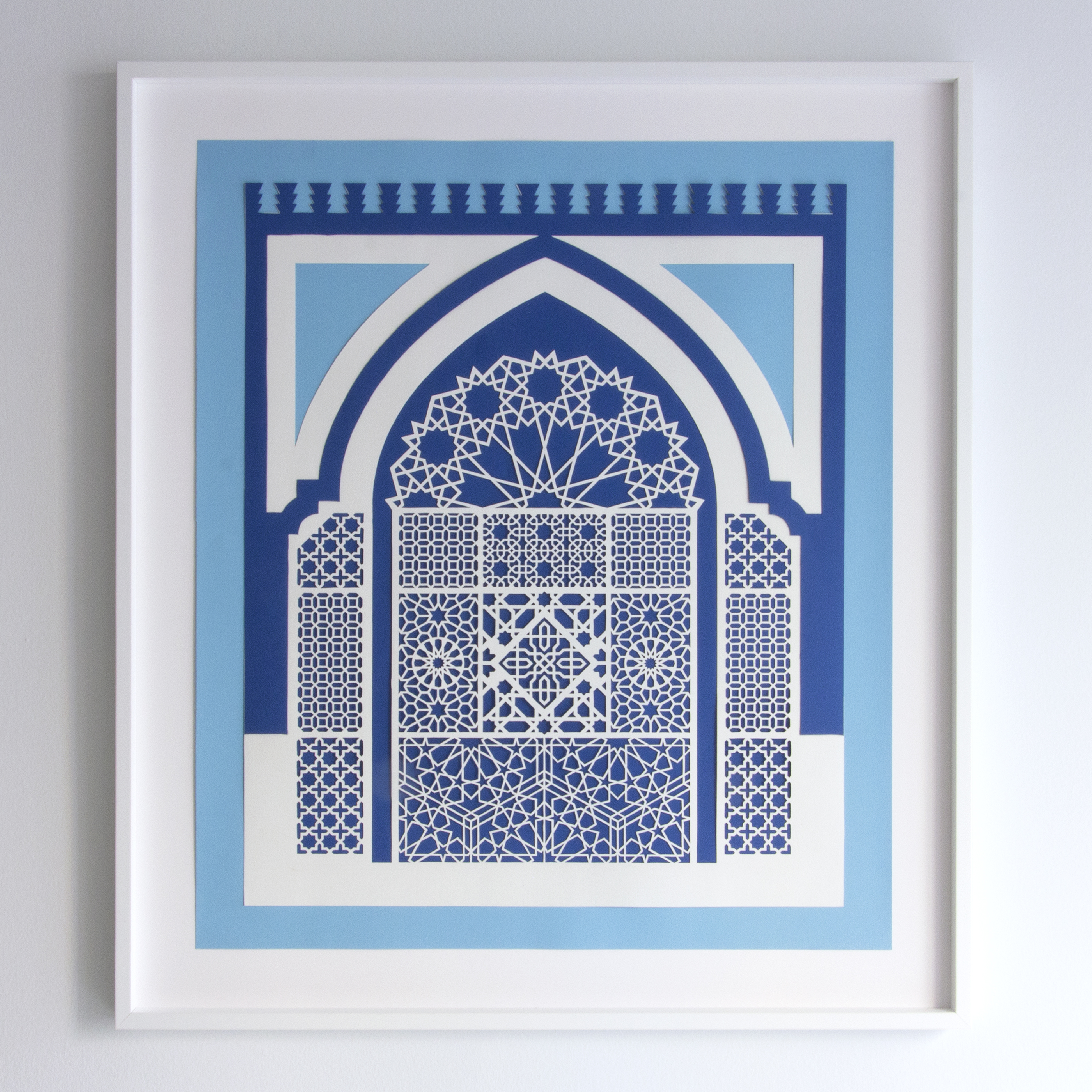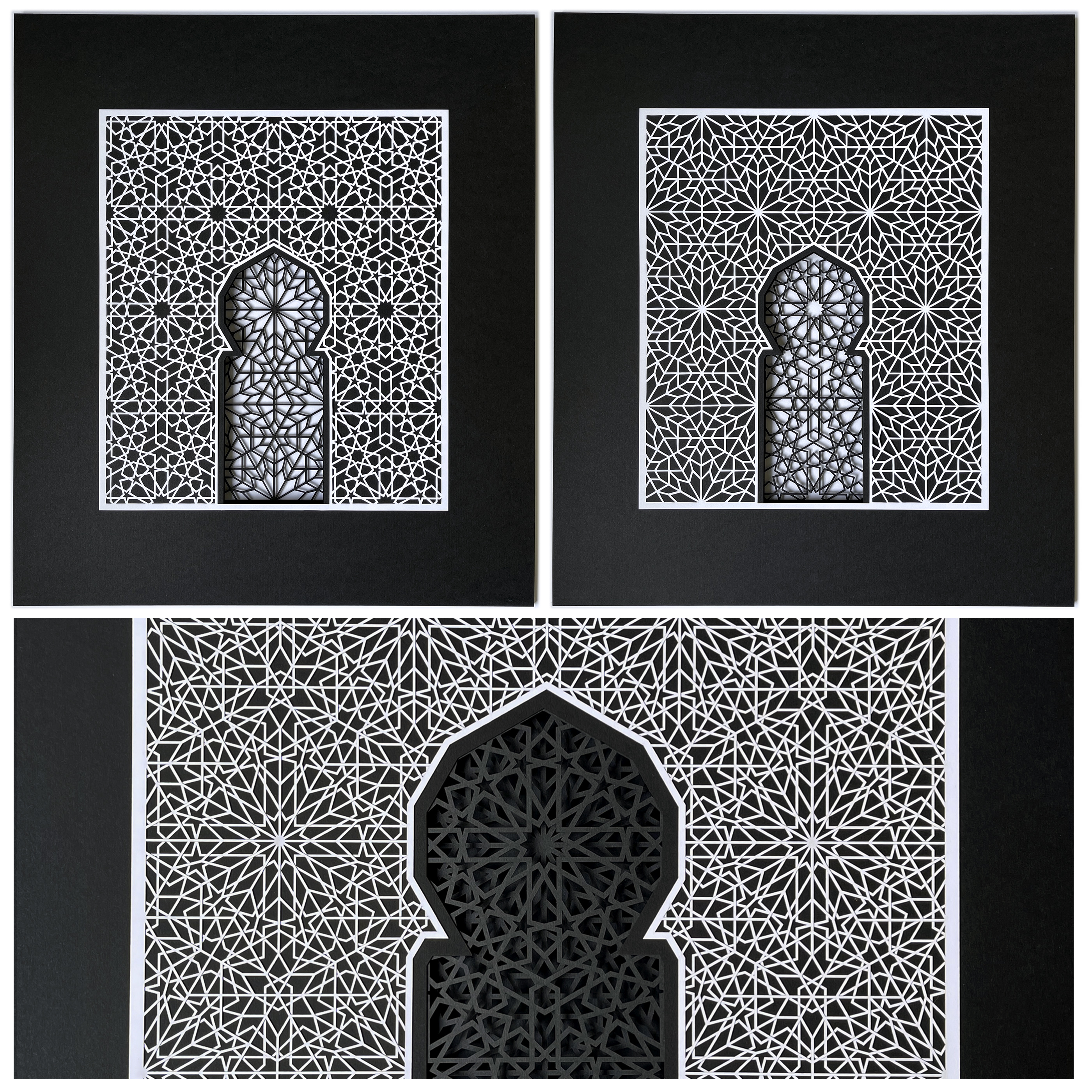 Il progetto é composto da due pezzi, la prima tavola ha una raffigurazione bifacciale e interattiva, tramite lo scorrimento di due fogli neri, con due mosaici differenti intagliati, che formano una porta, dal momento che si incontrano raggiungendo la perfetta simmetria tra di esse, prende vita così una nuova porta con un disegno più complesso e articolato. Mentre la seconda tavola è la metamorfosi della prima, tutti i fogli son sovrapposti l’uno sopra l’altro.