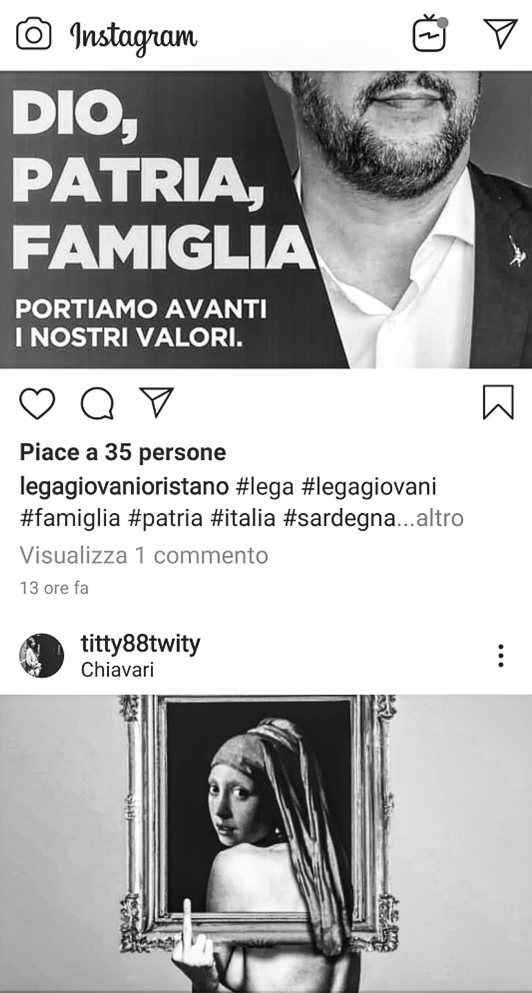 Partendo dalla riflessione sopra espressa ho voluto sperimentare un “bug” nel mio profilo Instagram. Ho seguito profili di persone, associazioni e partiti che mai nella vita avrei seguito, insieme a quelli che invece seguo perché apprezzo realmente.