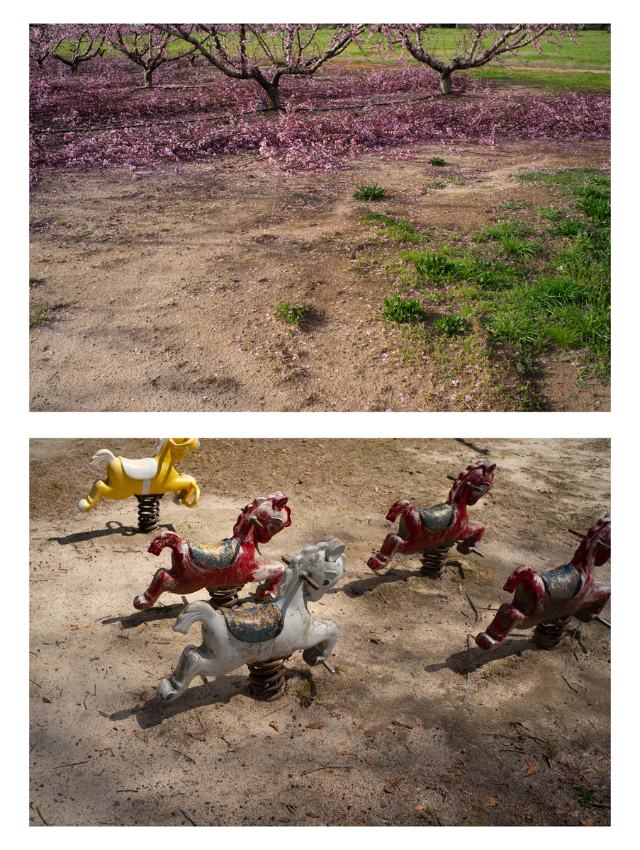 The curious quality of the region helped me to break from my normal use of a single image. I have maintained a process of photographing things only as I find them, yet communicating the landscape’s feel to the viewer desired more. Through the use of diptychs and the play of two images as one, I have been able to do create a visual narrative through one composition rather than relying on the whole of a series. The dual images, sometimes creating one but always performing in tandem, develop into an inquisition of themselves, the composition as a whole, and the peculiar feeling of the place they represent.