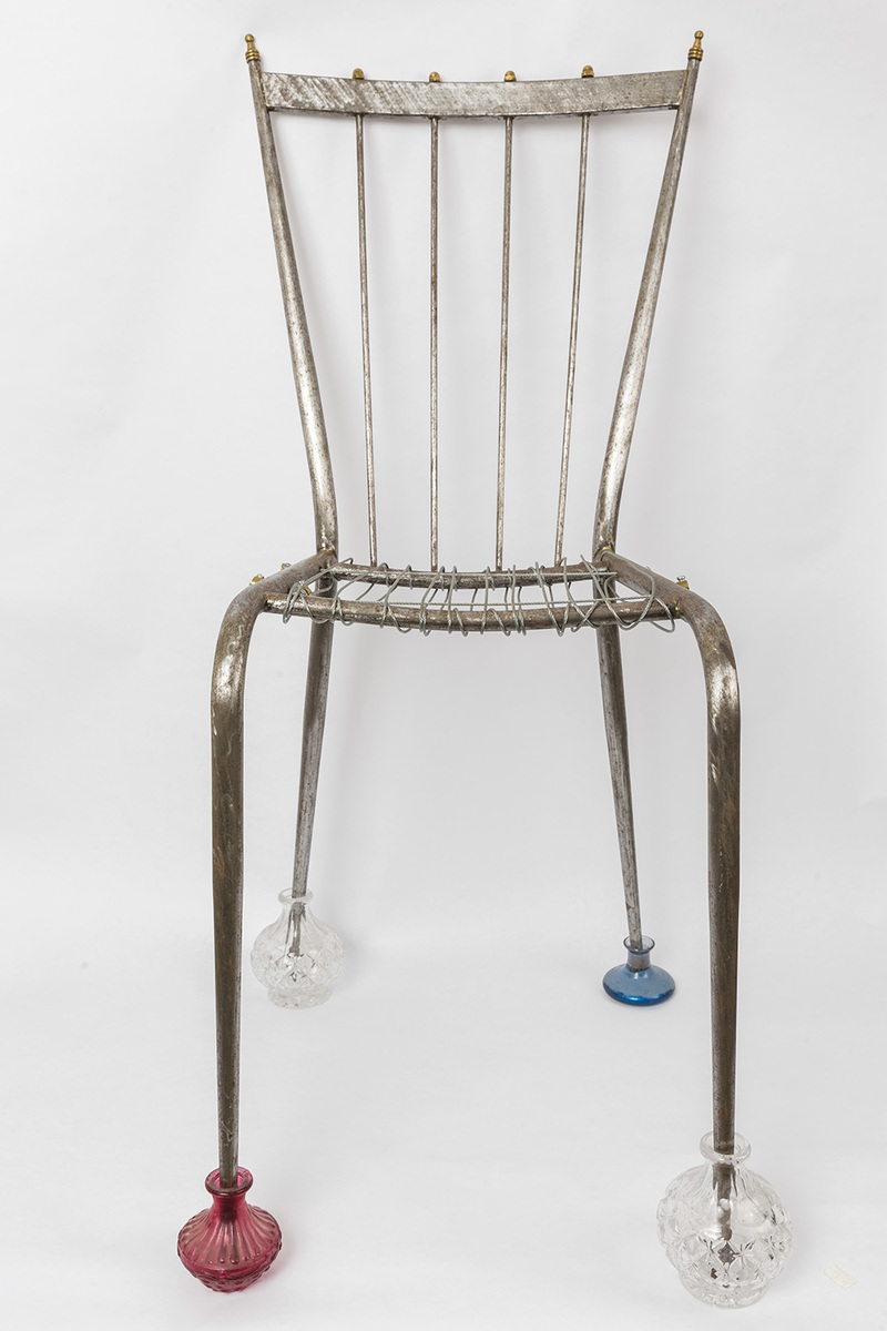 - L’opera è composta da una radice secca, alla estremità di ciascuna ramificazione e radichetta sono inserite paillettes e perline di agata. L’apice della radice è collocato nel collo di una bottiglia di vetro.