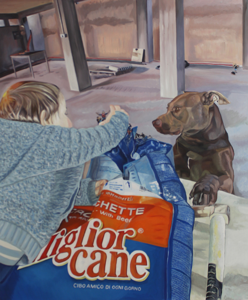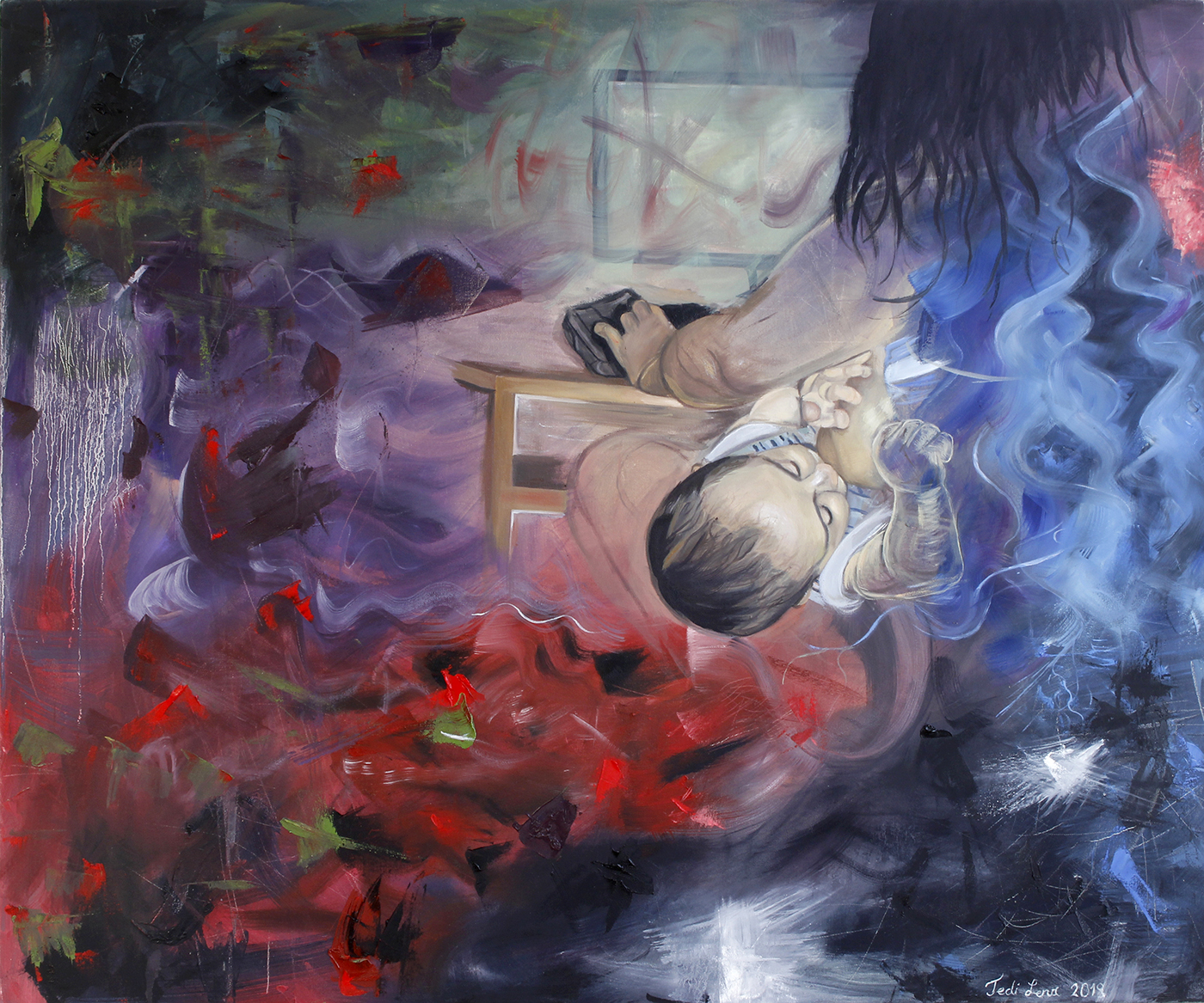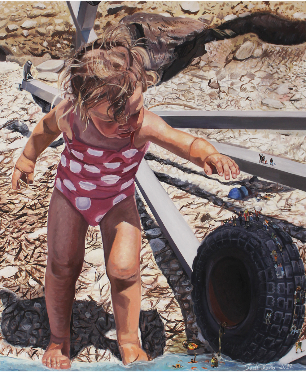 You notice the child is reaching out towards a group of miniaturised people! At her toes in the water are more people, are they drowning? will the colossus child reaching towards them and who represents the state/multi-nationals/global organisations, help or squash them. A fragile moment, loaded with responsibility and possibility, the light intense, the drama hight, the subtle use of my paint and delicacy of my brush strokes emphasises this critical moment in time.