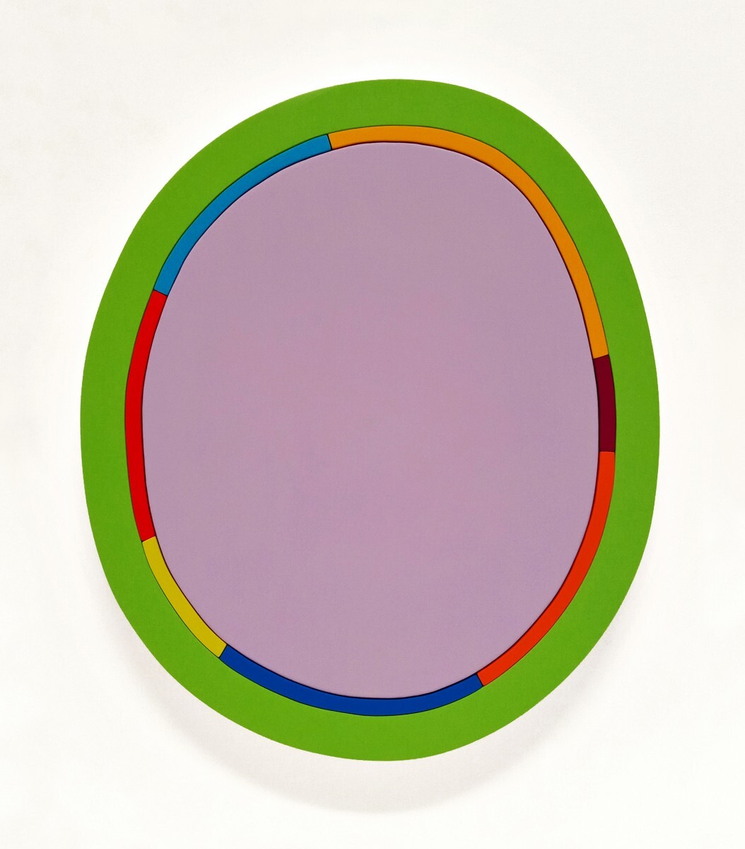 Nell’ opera pittura ovale 16-20 l’intermezzo tra l’anello di colore esterno e la superficie interna è caratterizzato da sezioni di legno dipinto che combaciano perfettamente tra i due elementi. Queste sezioni sono dipinte con tinte forti per rilevare il passaggio da una situazione di caos esteriore a una condizione di silenzio e meditazione interione. Il contorno verde è il preambolo di un passaggio nel mezzo della superficie centrale limpida e uniforme.
