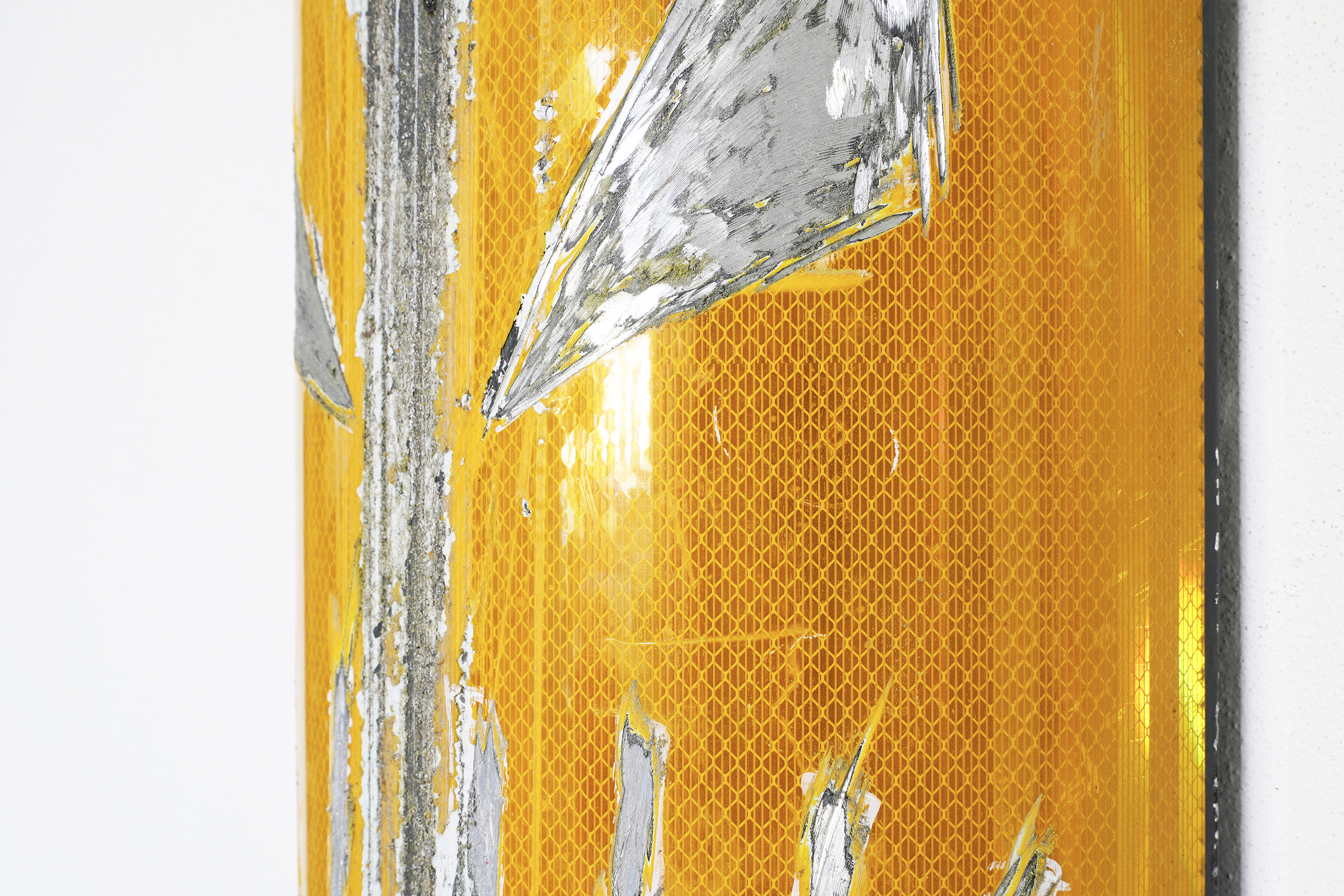 In ”Turner” la pellicola catarifrangente di un segnale stradale trovato viene fatta dialogare, tramite una grezza incisione manuale, con l’effetto semi-argentato del metallo sottostante, descrivendo un volto stilizzato; come una specie di totem post-industriale.