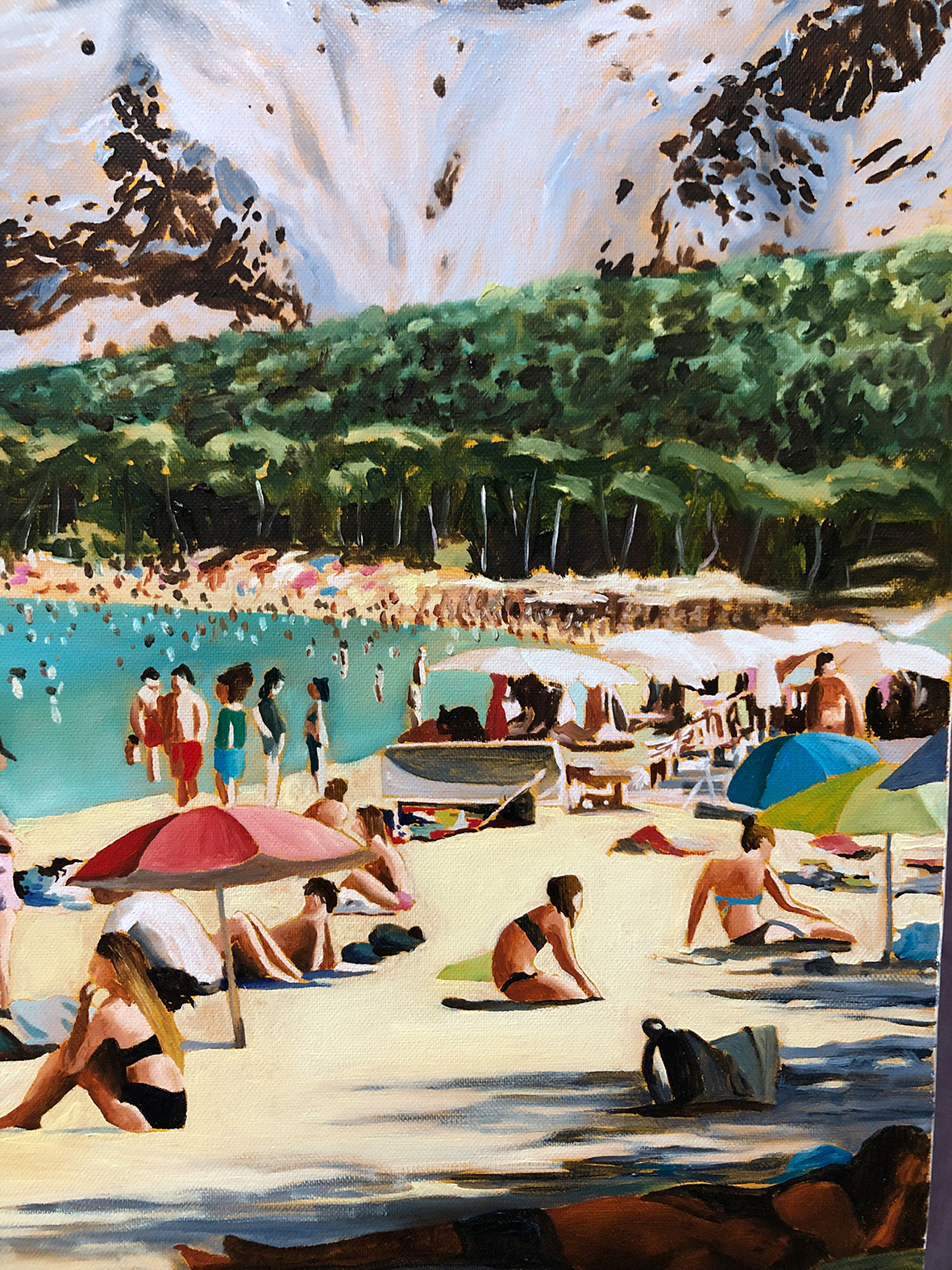 Una cartolina dalla villeggiatura, come si usava un tempo: la spiaggia è affollata di bagnanti, il sole accecante si riflette sulla baia dalle acque fresche e cristalline. Ma dietro la pineta costiera non figura l’entroterra estivo: picchi innevati si stagliano su un cielo dai bagliori rossastri. L’umanità si è sentita padrona del mondo, cercando di piegare la natura ed il clima al proprio volere, volendo godere di tutto nel medesimo istante, senza disagi, senza fatica, comodamente seduta sulla propria sedia a sdraio. Le stagioni sfumano l’una nell’altra perdendo i propri contorni, i confini tra ciò che è lecito pretendere dalla Natura e ciò che non lo è sono sempre più incerti - e chissà se le generazioni future potranno ancora inviarla, quella cartolina. La spiaggia è ispirata alla baia di Calvi (Corsica) e le montagne alle cime antistanti il colle della Bettaforca (Ao), entrambi luoghi visitati dall’artista in momenti di grande affollamento nello scorso 2023.