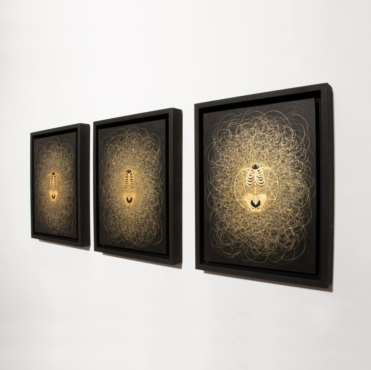 Il trittico presenta la scomposizione in parti simboliche dell’Enneagramma, mappa antichissima della conoscenza di sé, probabilmente nata nell’Antica Mesopotamia ed utilizzata all’inizio del 1900 dal filosofo e maestro di danze armeno G.I.Gurdjieff con una doppia valenza: come modello matematico del modo di procedere dei fenomeni e come modello della personalità umana. La parte minerale dell’essere umano è incastonata come una preziosa gemma all’interno della mappa, estroflettendosi e rilucendo nel flusso animico color oro che contrasta sul nero, profondo ed universale.
