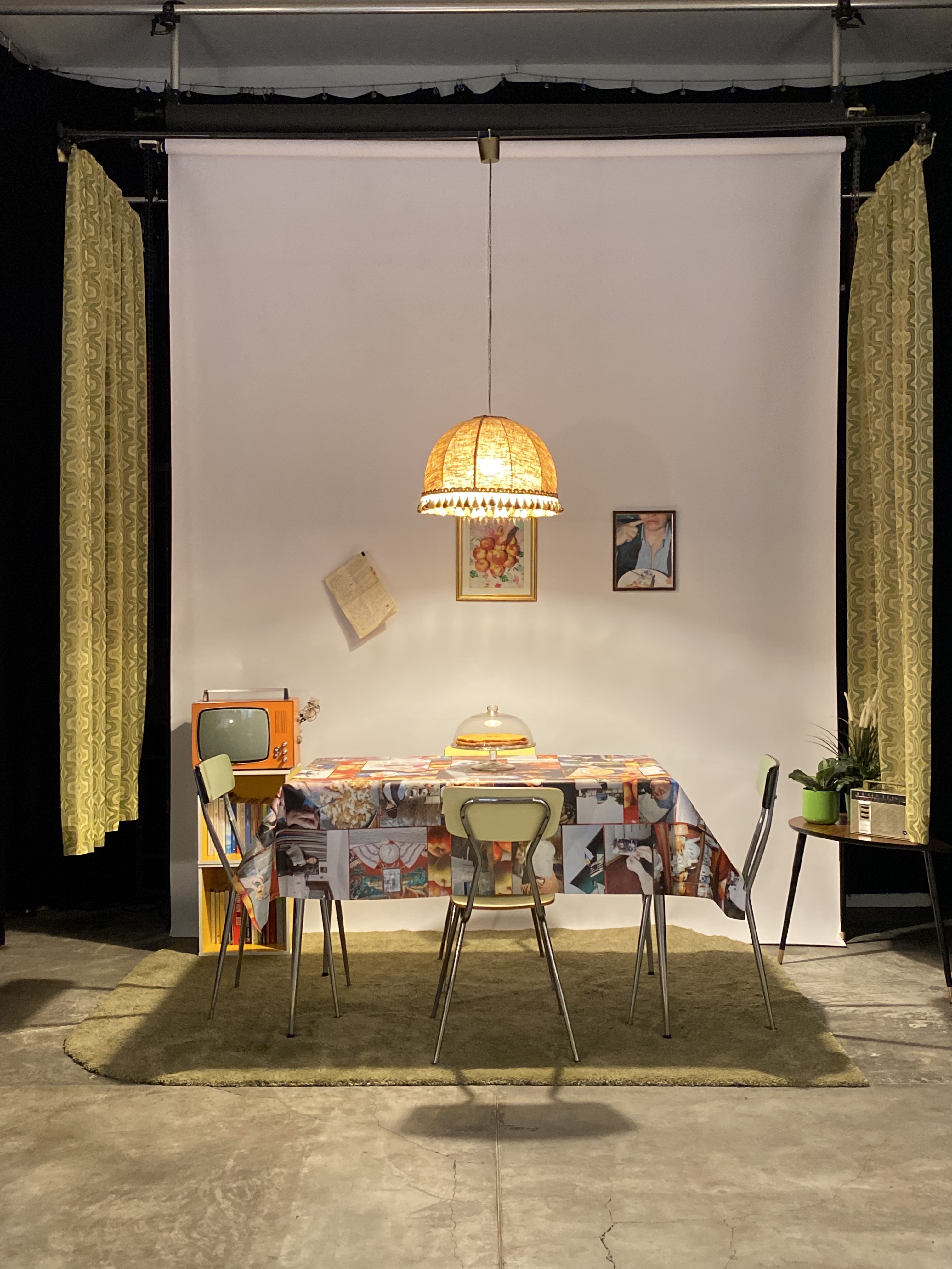 Una tovaglia di plastica si trasforma in un bizzarro percorso a ritroso lungo l’albero genealogico dell’artista, con uno sfasamento geografico, linguistico, generazionale.