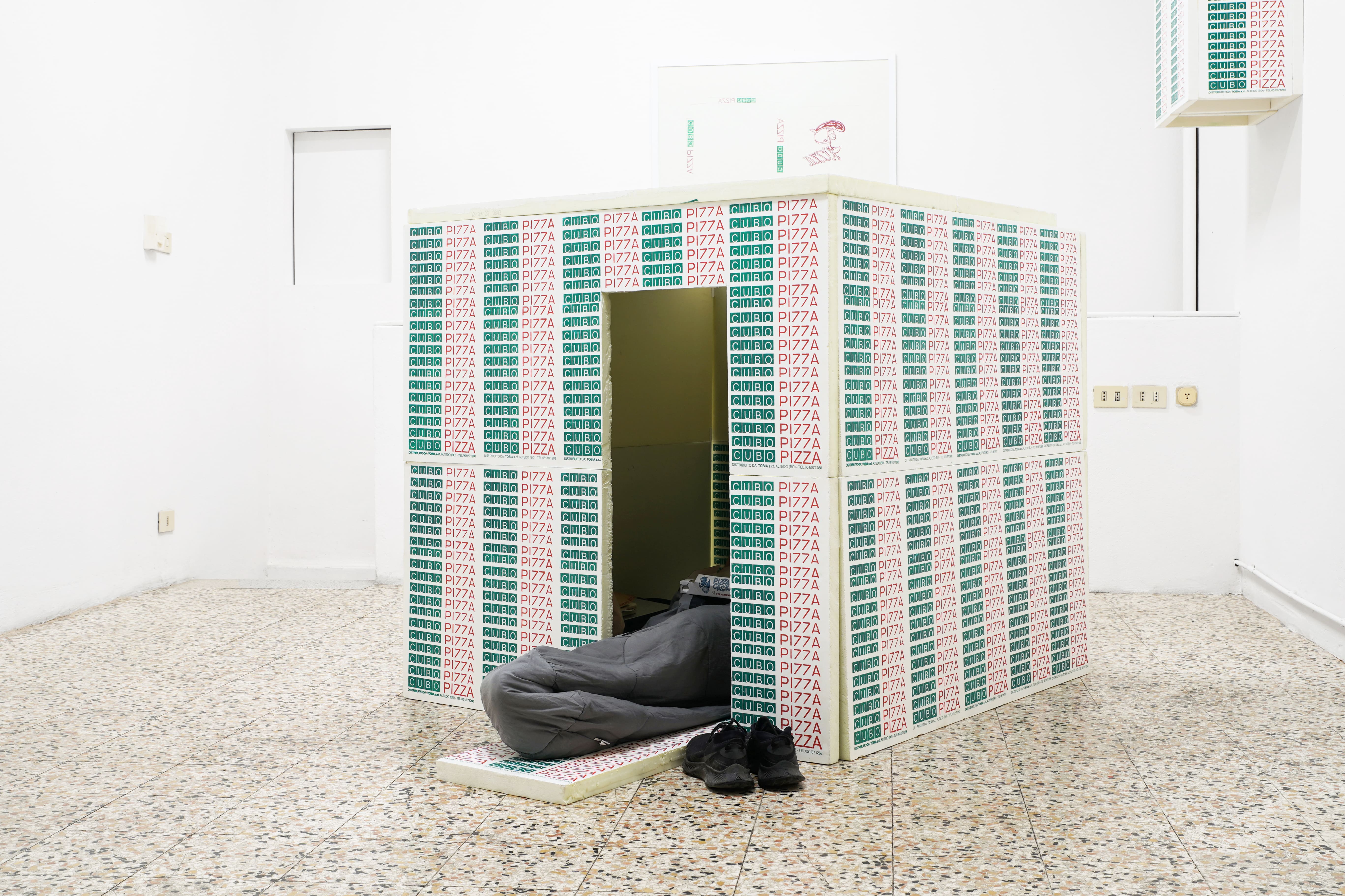 Durante la mostra Asac Azzip, a cura di Andrea Ceresa, ho vissuto per otto giorni nello studio di R. Bellelli e R. Michelini. Ho dormito in una casetta costruita con moduli di polistirene, dipinti e serigrafati, ispirati alla disposizione dei cartoni delle pizze impilati nella storica sede di Pizza Casa, la pizzeria prima situata in via Belle Arti a Bologna, chiusa nel novembre 2022 a seguito del crollo del soffitto del locale.