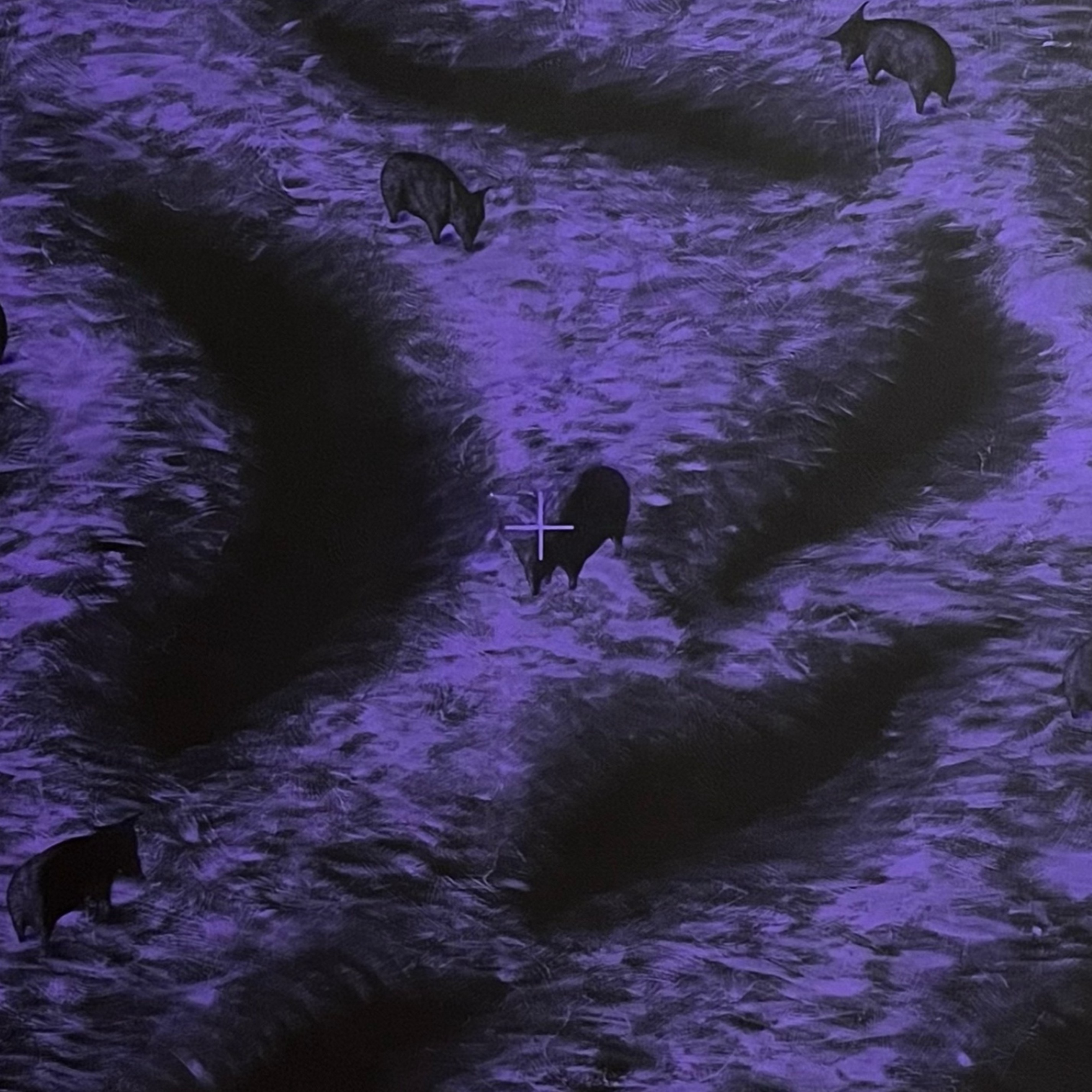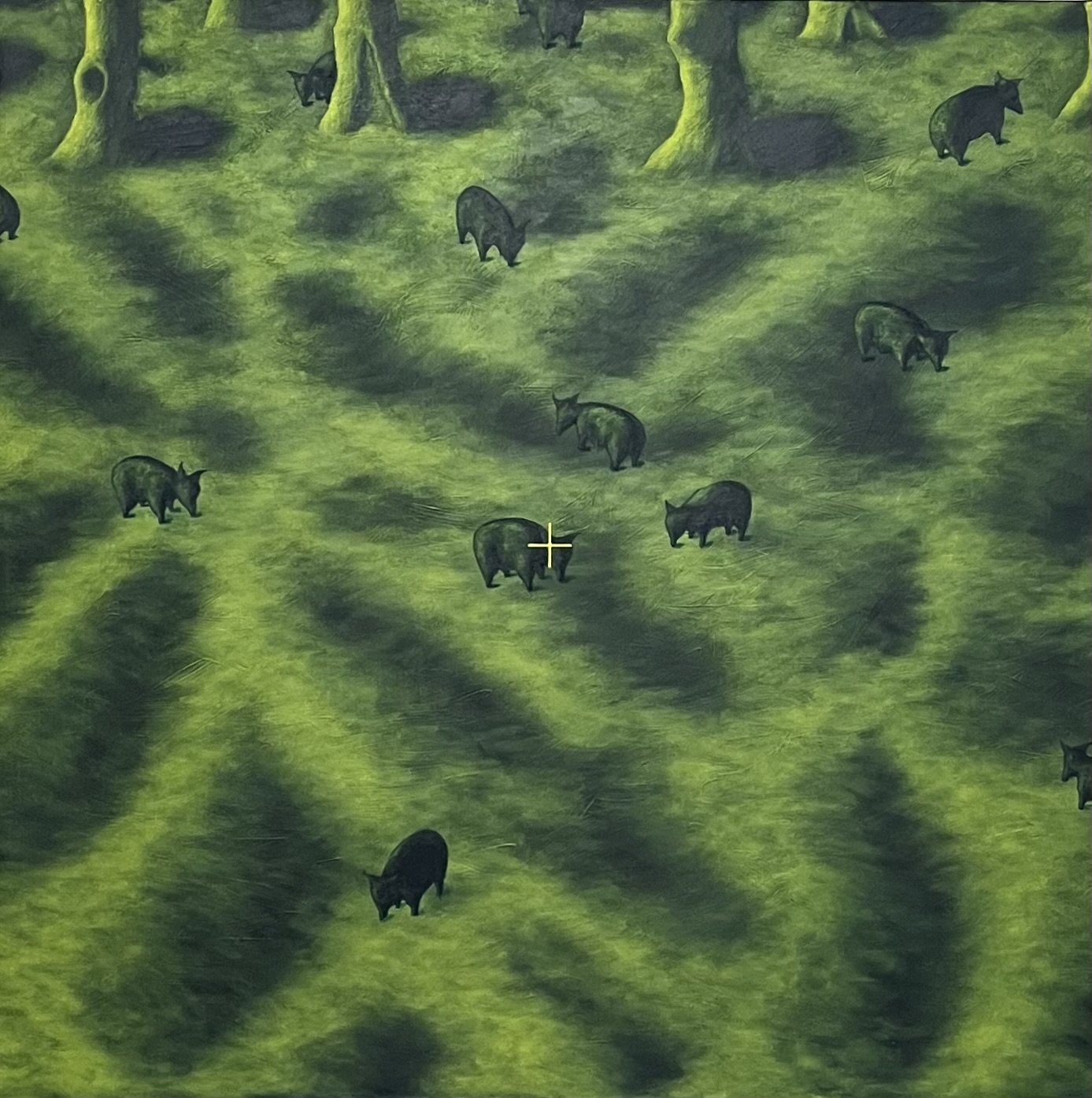 Il paesaggio tranquillo e pacato dove i maiali grufolano ha al centro della composizione un mirino. Il soggetto è preso in prestito dall’allegoria satirica di Orwell e insieme al mirino rappresenta la risposta viscerale, istintiva, al tradimento che i maiali, oligarchi, perpetrano nei confronti degli altri animali attraverso la violenza, l’inganno e la propaganda; tradimento allora della rivoluzione oggi, forse, del contratto sociale.