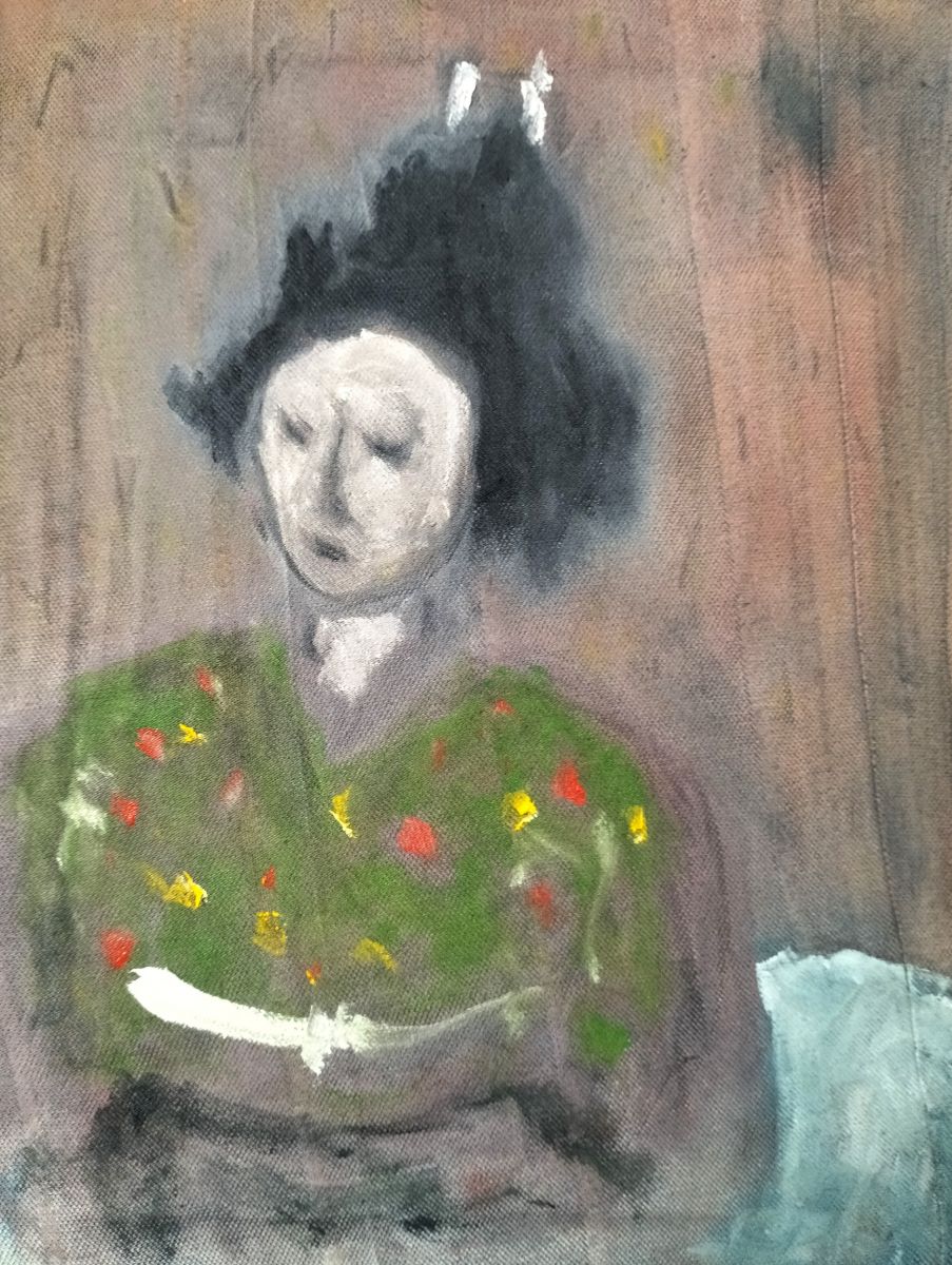 Il ritratto di una donna, dall’espressione decisa, si staglia sul fondo azzurro-verde di quella che sembrerebbe essere stata qualcosa di simile ad una mappa bipartita, solcata da una cucitura netta che divide il piano a metà, da lato a lato: acqua-terra, qua/là, sx/dx. Quel confine, limes visibile, solco di superficie, pare come evocare la sostanziale disparità e prossimità che intercorre tra rappresentazione e realtà, sembiante/fonte, materialità e icona. In questo senso va letta la ragione del titolo: “Fuori dal quadro il quadro non esiste se non come citazione”, come a dire che un quadro, una volta incarnatosi in una foggia-colore sostanziale, oltreché nello spazio di confine areale, esiste anche, quale citazione dichiarativa del quadro stesso, del suo portato profondo, non più rispondente al fenomeno-immagine da cui scaturì, ma solo attinente a sé stessa, alla sua propria entità, concreta e letterale.