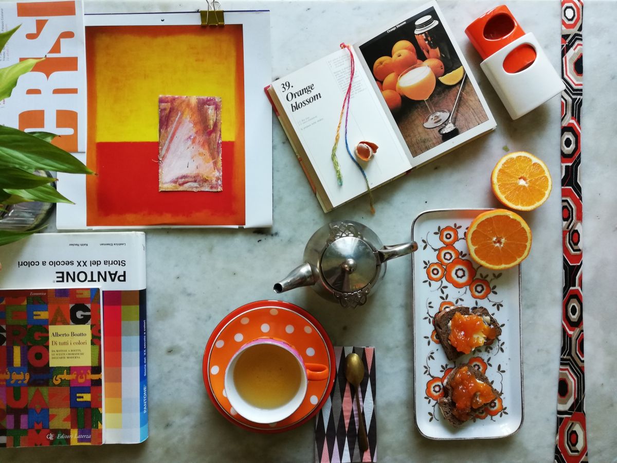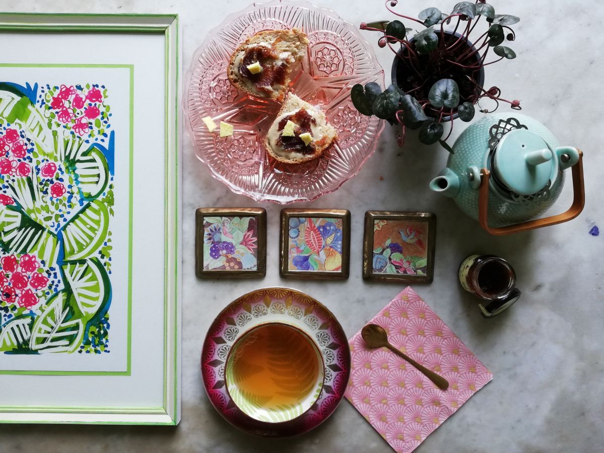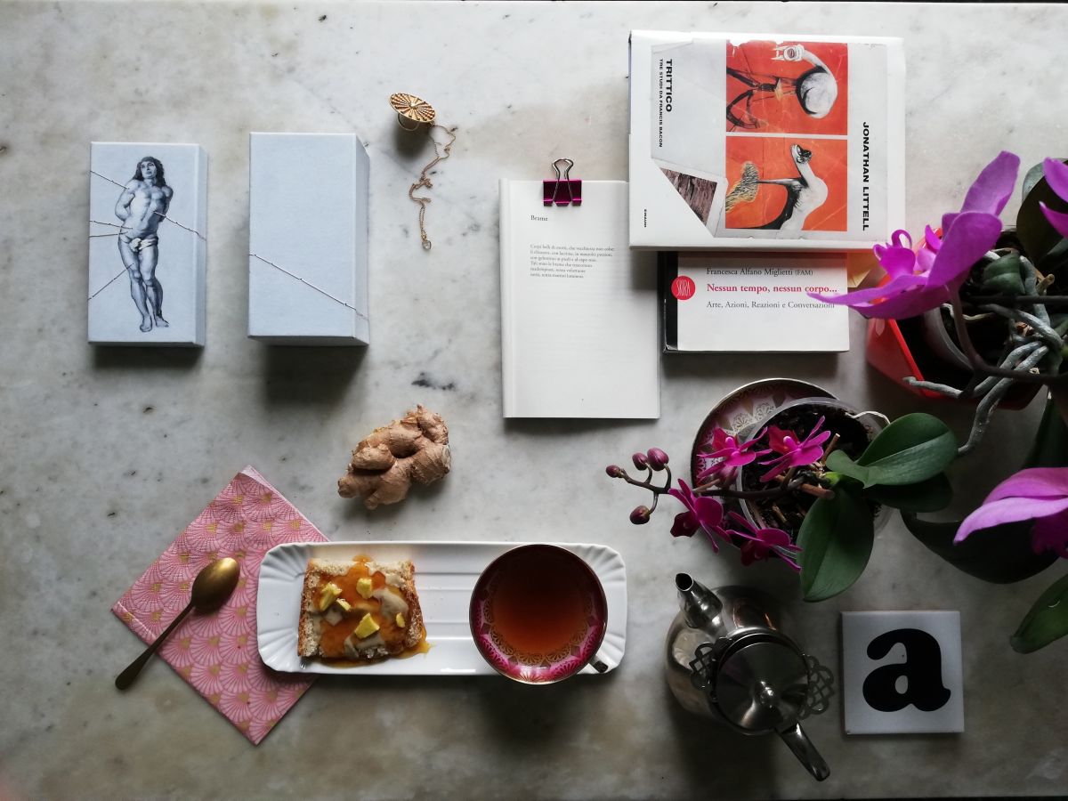 Fiori e piante, recisi o invasati, popolano a tratti un territorio, elementi naturali accanto composite “nature morte”: una collezione di multiformi ceramiche, vetri, libri, taccuini, carte, stoffe, manufatti che accompagnano, celebrandoli, i cibi del primo pasto. Uova, pane tostato, burro, tahin, confetture, frutta e rigorosamente tè, bevanda benefica e meditativa.