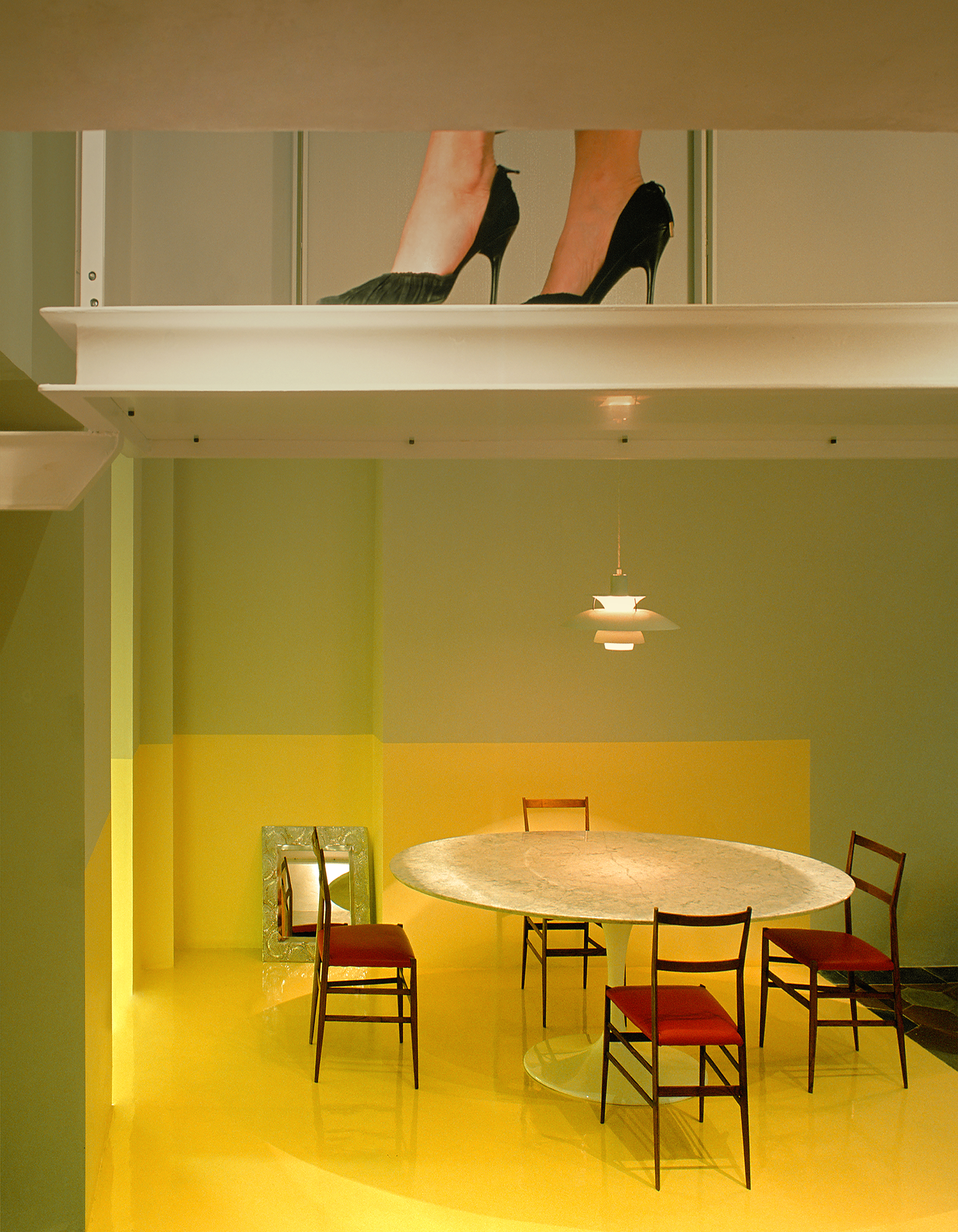 Una giovane coppia appena entrata nella casa della sua prima convivenza. È lì da pochi giorni, la casa è nuova, ancora da abitare. La giovane donna di cui non si vede il volto è colta in un momento privato. Sembra prepararsi per qualcosa che l’immagine non mostra, sospesa al di sopra della sala da pranzo illuminata, come in attesa. La casa da abitare è lo spazio dell’inizio di un nuovo periodo della vita, uno spazio quasi vuoto e quindi pieno di potenzialità e promesse di futuro: di una vita calda, accogliente, domestica ma anche, ancora, intima e sensuale.