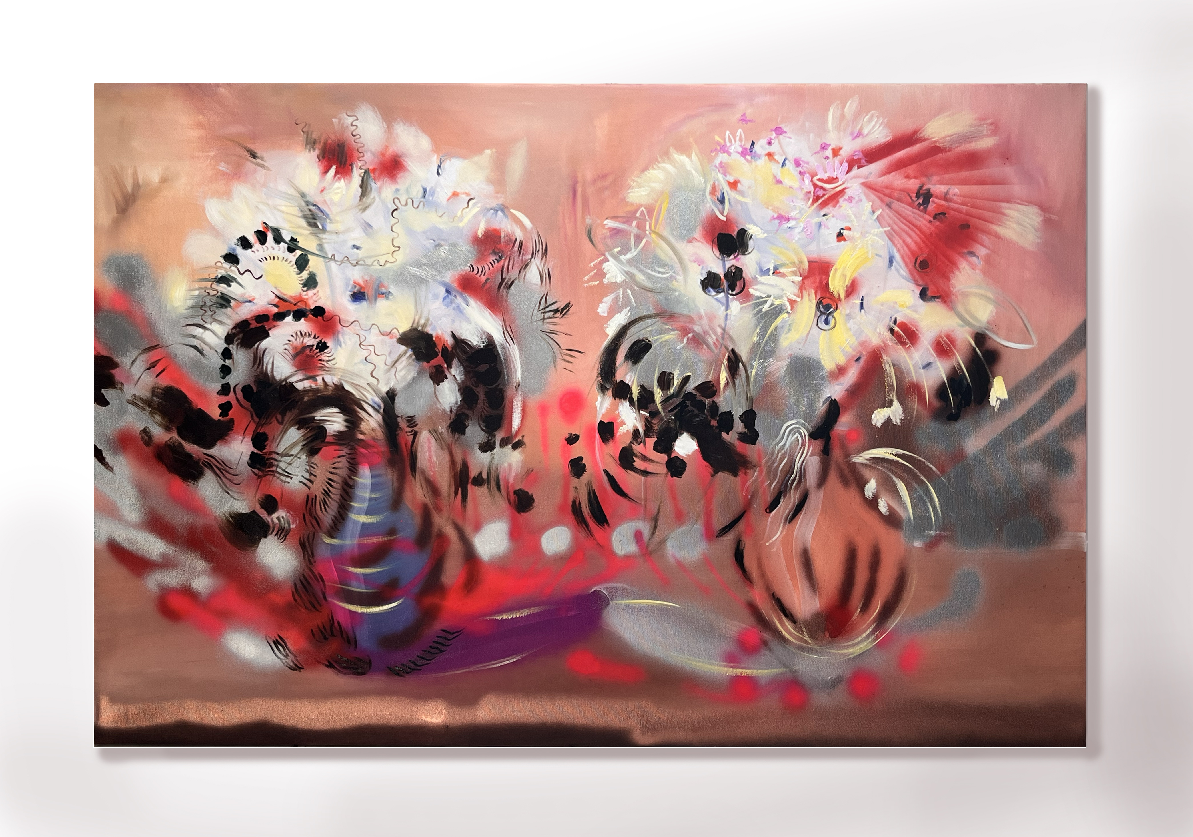 Doppio vaso con fiori è una serie di dipinti, di cui qui presente un solo quadro, che si inserisce nella lunga tradizione della pittura a soggetto floreale, concentrandosi su una variazione minima e strutturale del soggetto. Cosa succede a raddoppiare il vaso con fiori? Una sbieca modifica dello spazio pittorico e un’indagine sui perché i vasi con fiori sono, per eccellenza, figure singole e solitamente isolate dal resto, dal tutto. Relazionare un vaso con fiori a un altro vaso con fiori sembra leggermente troppo, verrebbe da distanziarli, o sistemarli in due stanze separate. Il che è come riconoscere che ogni soggetto floreale produce un campo energetico di segno identico, e come magneti, tenderebbero a rifiutarsi tra loro. È possibile mettere in discussione un vaso con fiori avvicinandogliene un altro? La serie interroga come il soggetto floreale, per sua natura esclusivo e autosufficiente, reagisca all’intrusione di un secondo polo simile e perché la storia dell’arte restituisca pochi esempi pittorici simili.