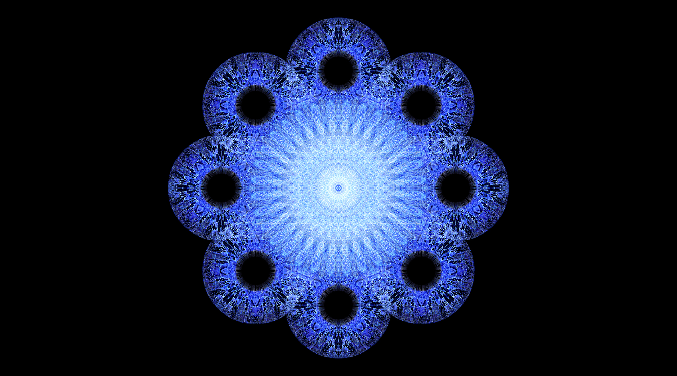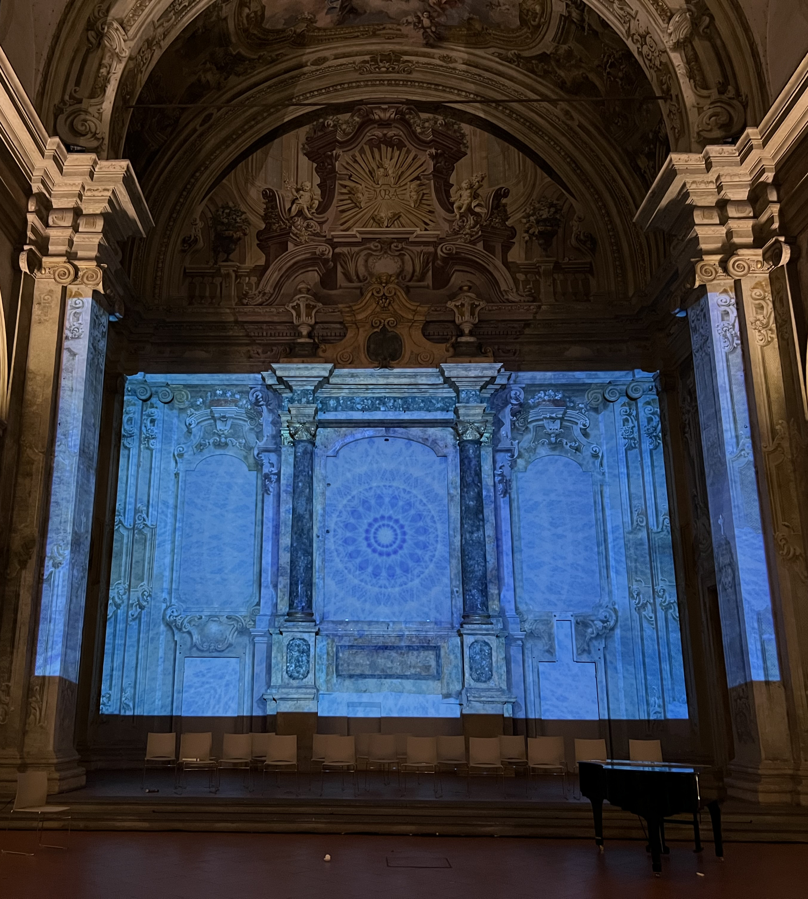 Le sonorità del compositore Nicola Evangelisti accentuano l’andamento ipnotico e rotatorio delle forme conducendo lo spettatore in un viaggio dentro uno spazio avvolgente in continuo mutamento. Dal particolare si arriva all’universale e viceversa in un continuo rimando di percezioni tra microcosmo e macrocosmo.