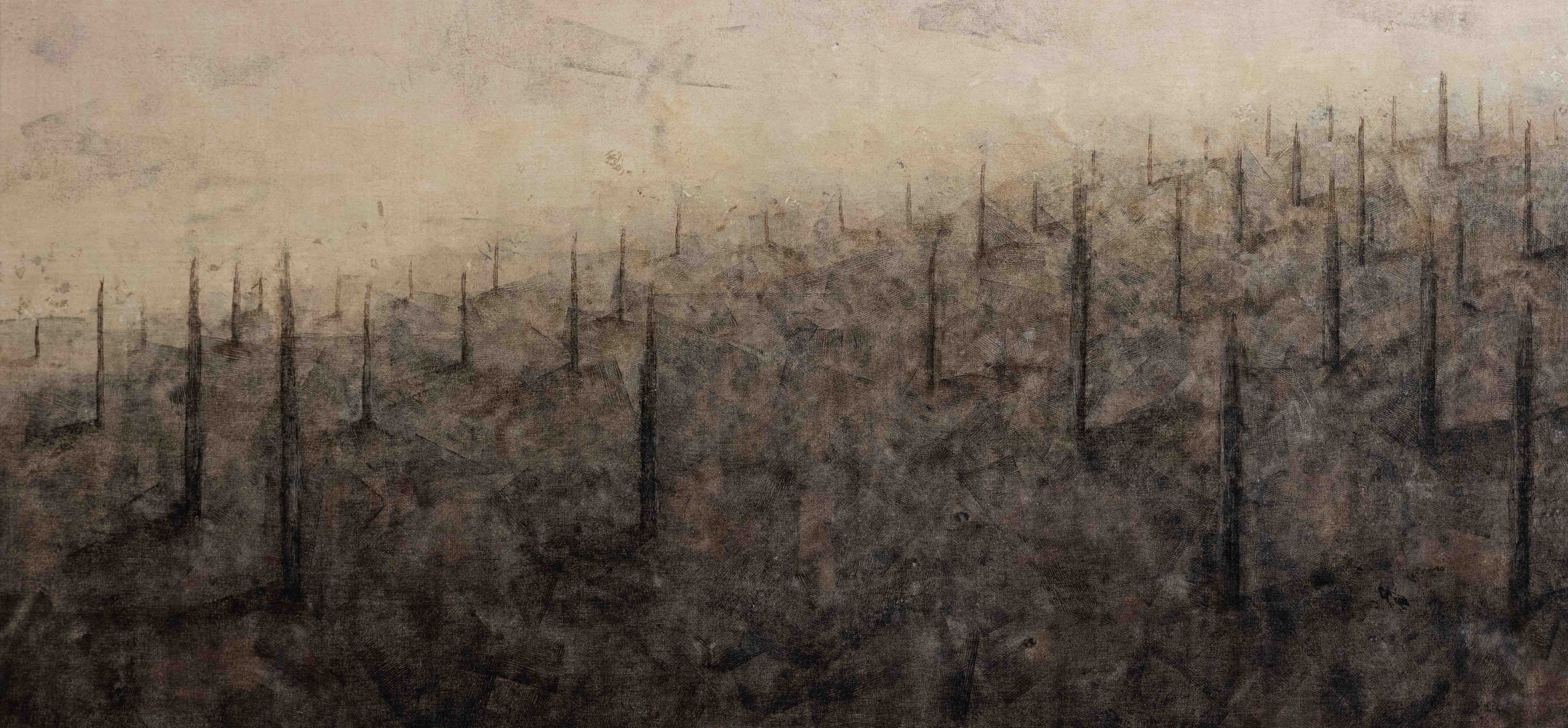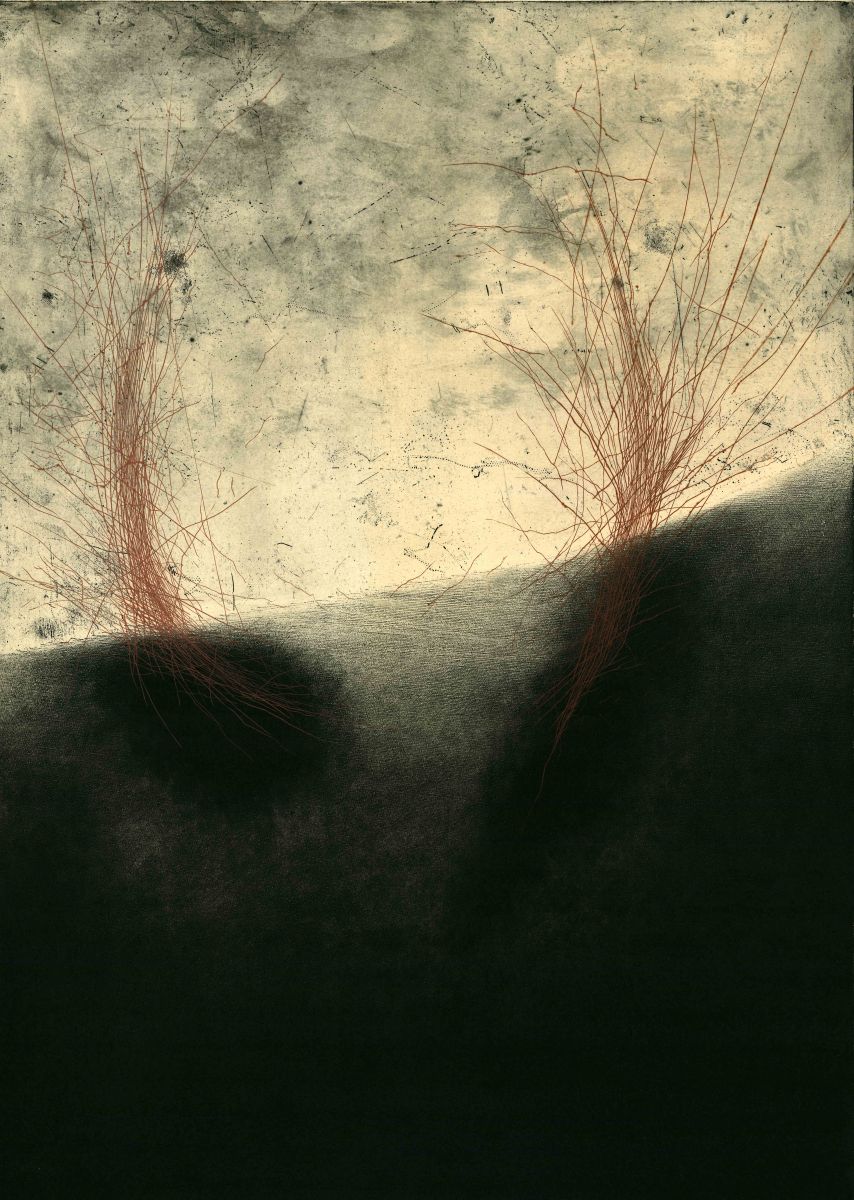 La sua pratica, a volte sottovalutata nel contemporaneo, ha una componente gestuale molto forte e personale, la minuzia nella creazione delle matrici, diverse per tecnica e tempistica ogni volta, lascia posto all’istinto nel tracciare il segno. Crea mondi immaginari, luoghi urbani nati dall’immaginazione, come architetture che sovvertono la tradizionale percezione dello spazio e del tempo, un senso di smarrimento per chi si trova a visitarli, senza più il supporto delle rassicuranti coordinate spaziali e geografiche. Paesaggi spesso malinconici con grandi spazi deserti, o meglio disabitati. Importante per l’artista è la componente umana delle sue creazioni: questi mondi oggi disabitati sono stati vissuti un tempo da uomini, e il passaggio dell’uomo è testimoniato dalle piccole architetture – strutture decadenti, finestre, tralicci, torri abbandonate – fatiscenti che egli si lascia alle spalle. Il suo stesso atto di ricostruzione parziale di questi scheletri di città e il segno che lascia con il suo gesto, sono la testimonianza del suo passaggio su questa terra. Attraverso questi mondi l’artista vuole farci riflettere sulle contraddizioni della società contemporanea; sulle relazioni umane e la loro instabilità, sulla società intesa come una rete di relazioni, anch’ essa, di riflesso, caratterizzata dalla stessa instabilità delle costruzioni rimaste, accentuandone con il suo intervento, fragilità e incertezza, situazioni precarie che inevitabilmente evocano in noi un senso di solitudine. Queste architetture rimaste hanno anche un ruolo positivo nella storia: sono sopravvissute all’uomo come elementi di collegamento, connessione, a memoria dei legami che, nonostante tutto, sopravvivono al passare del tempo. Ambienti in cui l’artista ritrova la sua intimità e la sua quiete e in cui ricerca un diretto contatto con lo spettatore che, come un visitatore, viene invitato ad entrare in questi spazi con tutta la sua curiosità e voglia di scoperta. Il procedimento creativo è sempre molto lungo e si concretizza in diversi passaggi ripetuti e stratificati, è un lavoro fisico quanto immaginifico. C’è una matrice, una genesi segnata dell’opera risultante, ma quasi mai uno schizzo preparatorio, tutta la creazione avviene con precisione ma con spinta istintiva.