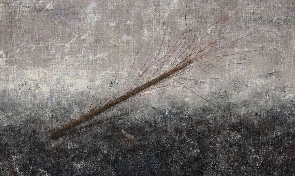 Il dipinto qui presentato è realizzato attraverso un procedimento del tutto grafico, appunto inchiostrando e stampando manualmente sulla tela varie matrici xilografiche incise a sgorbia e altri materiali di recupero.