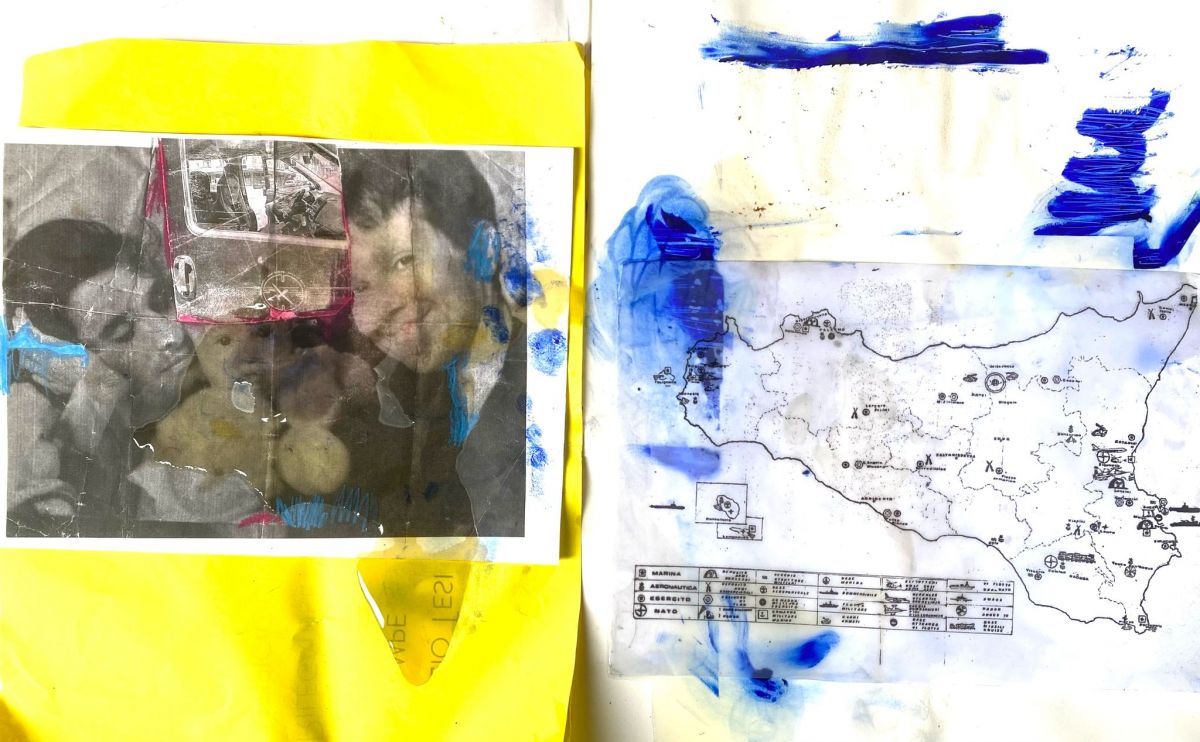 Geopolitica e affetto si mescolano in questa immagine. In un mondo schiacciato dalla pressione tecnologica. Una memoria personale e intima, trattata con oli, pastello a cera e grassi si fonde con una mappa geostrategica della Sicilia. Isola degli dei che ha generato la Lingua Italiana con Jacopo da Lentini.