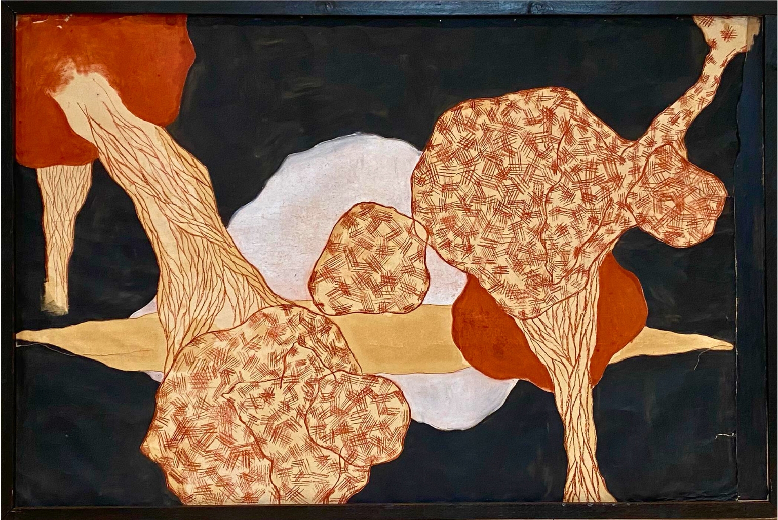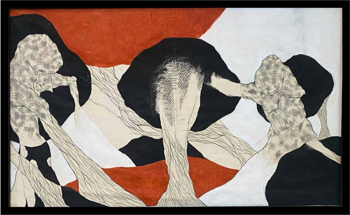 Spettro esplora la soglia tra il visibile e l’invisibile, forme organiche emergono da un fluire ancestrale di materia e memoria. Attraverso l’uso di linee, mai dritte se non all’interno dei corpi antropomorfi, e del contrasto cromatico, l’opera dà vita a presenze instabili, quasi cellulari, che si muovono in uno spazio sospeso tra origine e dissoluzione. Carta continua qui la sua indagine sulla percezione umana, sulla frammentarietà dell’esistenza e sulle forze sottili che ci governano, rinunciando a ogni rappresentazione convenzionale per far affiorare la trama invisibile che lega il corpo all’universo e Spettro è insomma un’indagine visiva sulle forze invisibili che attraversano la materia e l’essere umano.