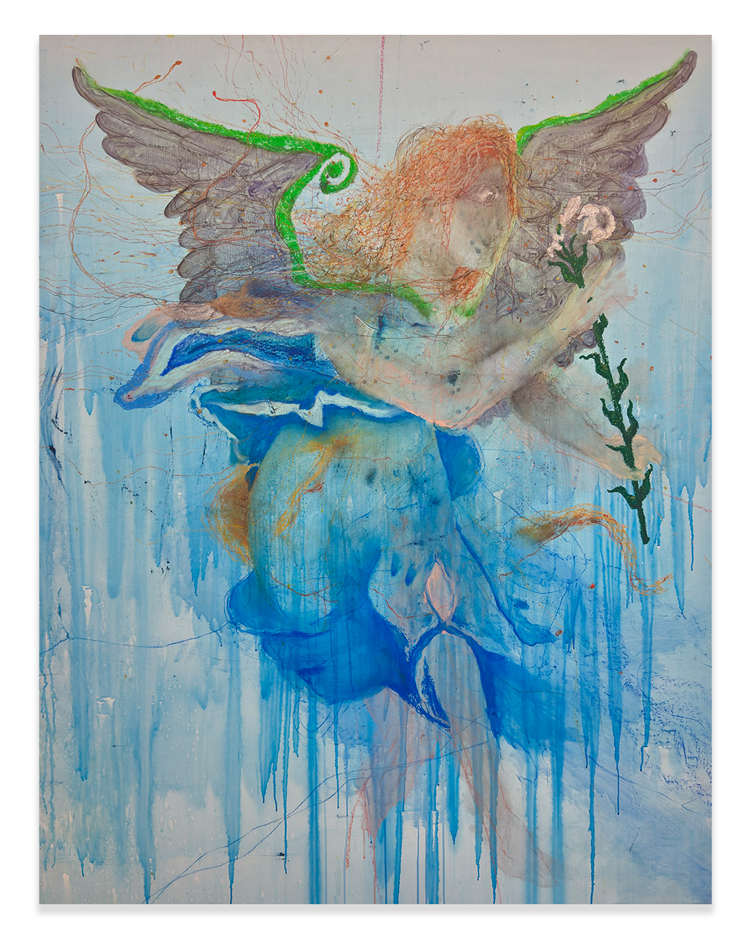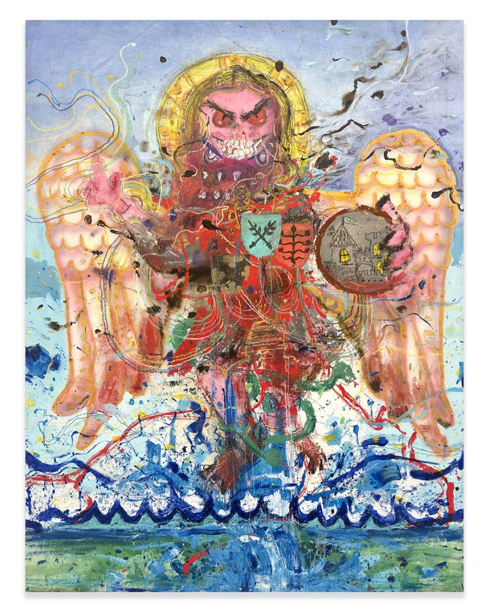 Al centro della composizione si staglia una figura androgina, che fonde tratti maschili e femminili, rafforzando così la sua dimensione archetipica e universale. Il volto, segnato da uno sguardo intenso e solenne, è incorniciato da capelli scompigliati e da una leggera aureola luminosa, che ne sottolinea la natura spirituale. Le ali, scure e profilate da un verde serpeggiante, evocano una duplice identità sospesa tra l’angelo e il demone, tra purezza e corruzione.