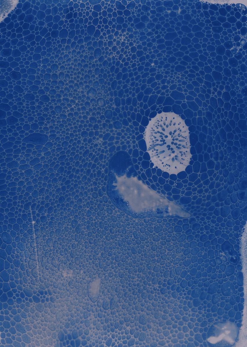 Acqua Viva è un’opera che si sviluppa come un racconto visivo composto da nove immagini, frutto di sperimentazioni fotografiche realizzate con tecniche di stampa naturali, ecologiche e basate sull’acqua. Il percorso si apre con tre cyanolumen prints, in cui antiche carte fotografiche scadute rivivono attraverso la luce solare e il contatto salmastro dell’oceano, dando vita a composizioni poetiche che trasformano l’obsolescenza in bellezza. Prosegue con tre antotipi, immagini impresse direttamente da pigmenti vegetali estratti da alghe raccolte lungo le coste atlantiche: qui, la materia naturale si fa immagine e memoria, in un gesto di profonda connessione con l’ambiente. Il ciclo si chiude con tre cianotipi, omaggio all’essenza stessa dell’acqua: una medusa, rinvenuta sulla battigia, si dissolve in intense sfumature di blu, generando un dialogo liquido e silenzioso tra luce, mare e immaginazione.