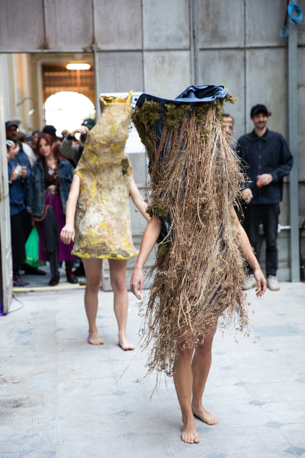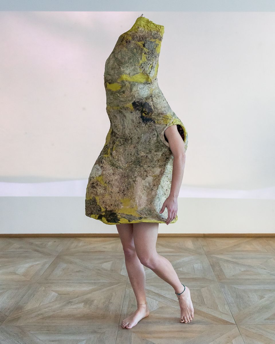 Le due sculture si presentano come assemblaggi liminali: strutture di metallo, carta e stoffa ricoperte da muschio, sterpi e alghe di stagno (raccolte e convertite in un biomateriale simile alla carta). Non più oggetti né organismi, ma dispositivi ibridi che attivano una relazione corpo-ambiente: quando indossate, trasformano il movimento in azione site-specific, il loro incedere mappa territori dove rifiuti industriali, rigenerazione vegetale e fisicità collidono. Avviene così un tentativo di superamento della divisione tra artificiale e organico; il corpo diventa interfaccia, trasformandosi in un ”Quarto paesaggio”.