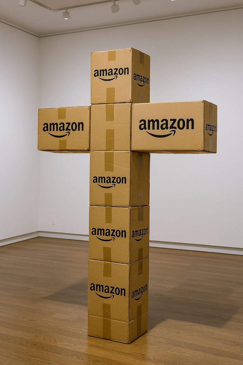Holy shit I need that! è una scultura a forma di croce composta da scatoloni Amazon di recupero. L’opera mette in relazione il simbolo della croce, carico di significati spirituali e culturali, con uno dei marchi più riconoscibili del capitalismo digitale. Il titolo evoca l’impulso immediato e irrazionale del desiderio consumistico, diventato ormai un riflesso quasi automatico. Mattia Ciaf propone una riflessione critica sull’adorazione contemporanea per il consumo istantaneo, in cui il bisogno si confonde con il marketing e l’identità si plasma attorno a ciò che si acquista.