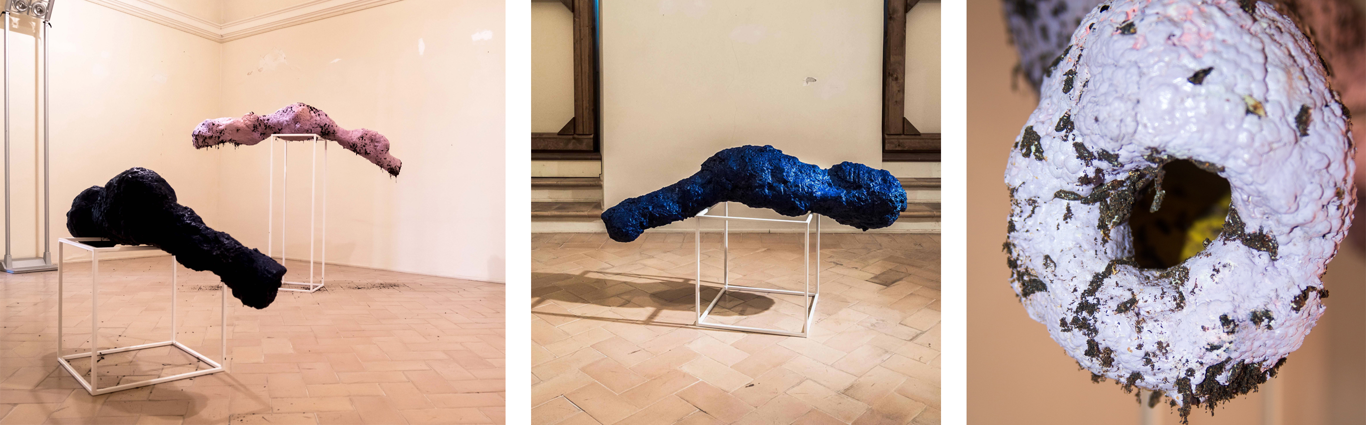 dittico di sculture a tutto tondo in metamorfosi, acciaio inossidabile verniciato a polvere, gesso, mastice, tessere di mosaico da scarti organici di apicultura processati e ricolonizzati da camole, pittura murale, gouache.