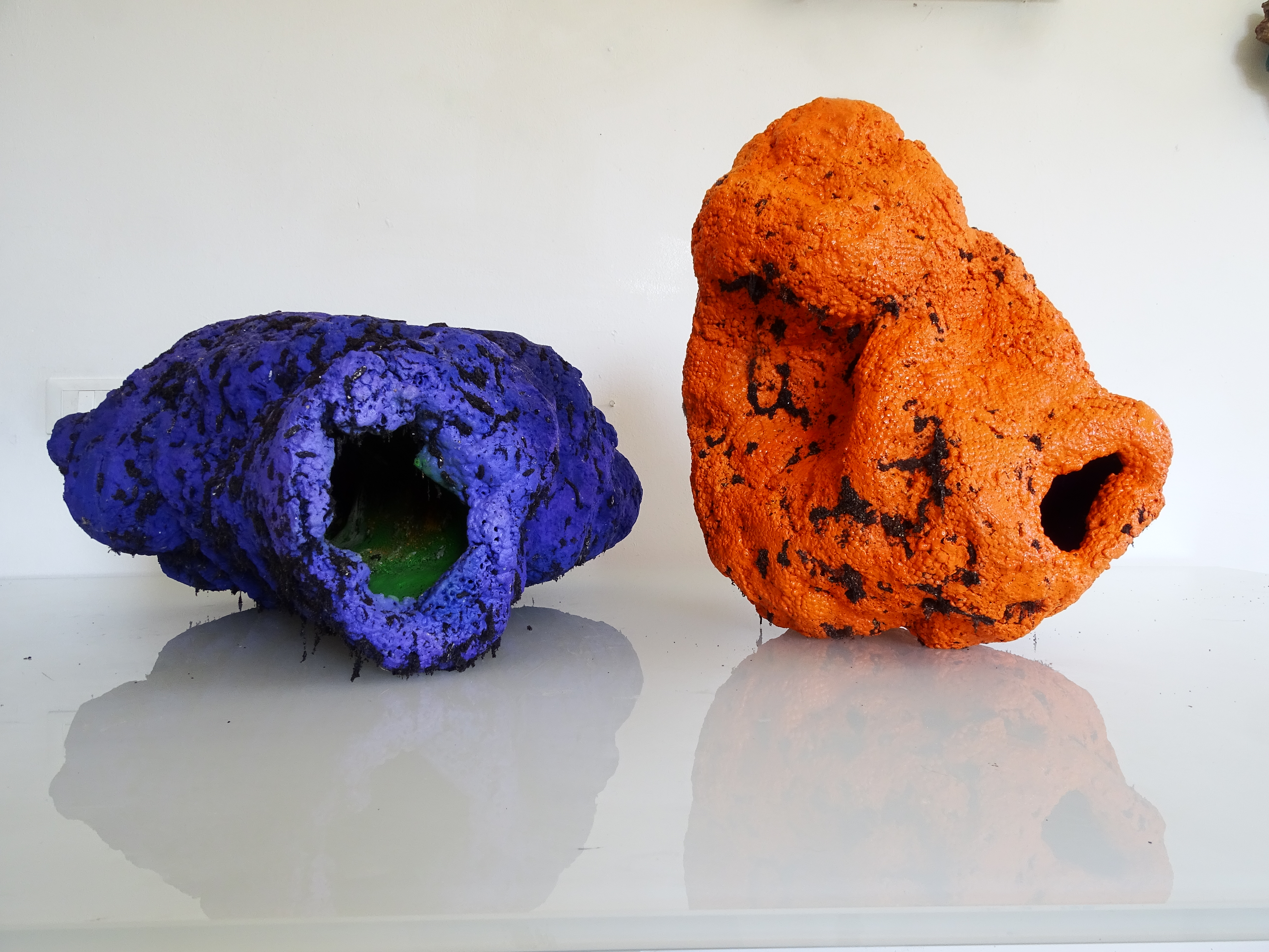dittico di sculture musive a tutto tondo in acciaio e materiale organico in metamorfosi, acciaio inossidabile verniciato a polvere, cemento, mastice, tessere di mosaico da scarti organici di apicultura ricolonizzati da camole, pittura murale, gouache.