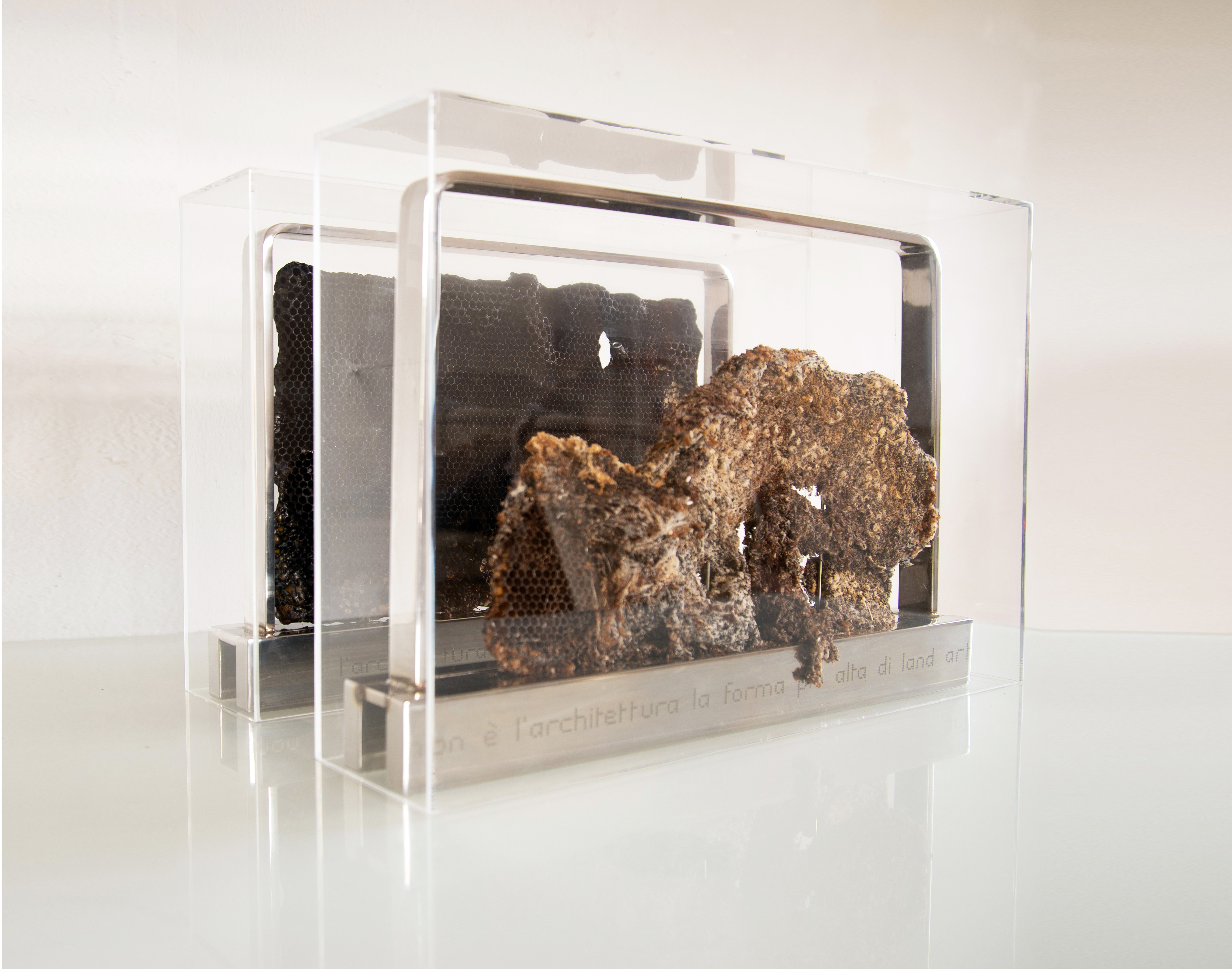 scultura a tutto tondo, pratiche ferali, fiber art, stampa laser, acciaio lucidato a specchio, tessuto organico prodotto da camole, plexiglass
