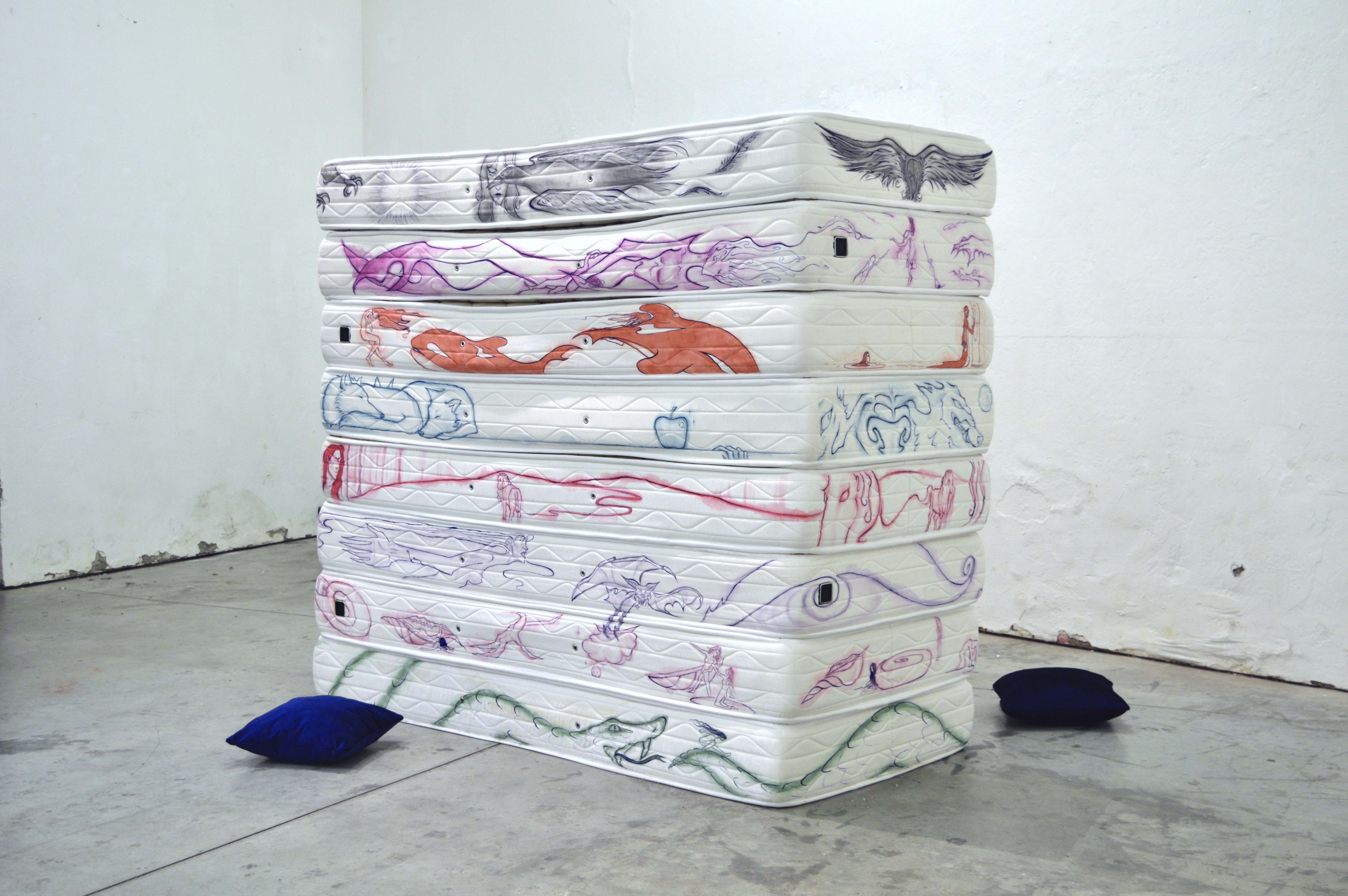 The installation consists of a pile of eight mattresses, on which animals from specific dreams have been painted.